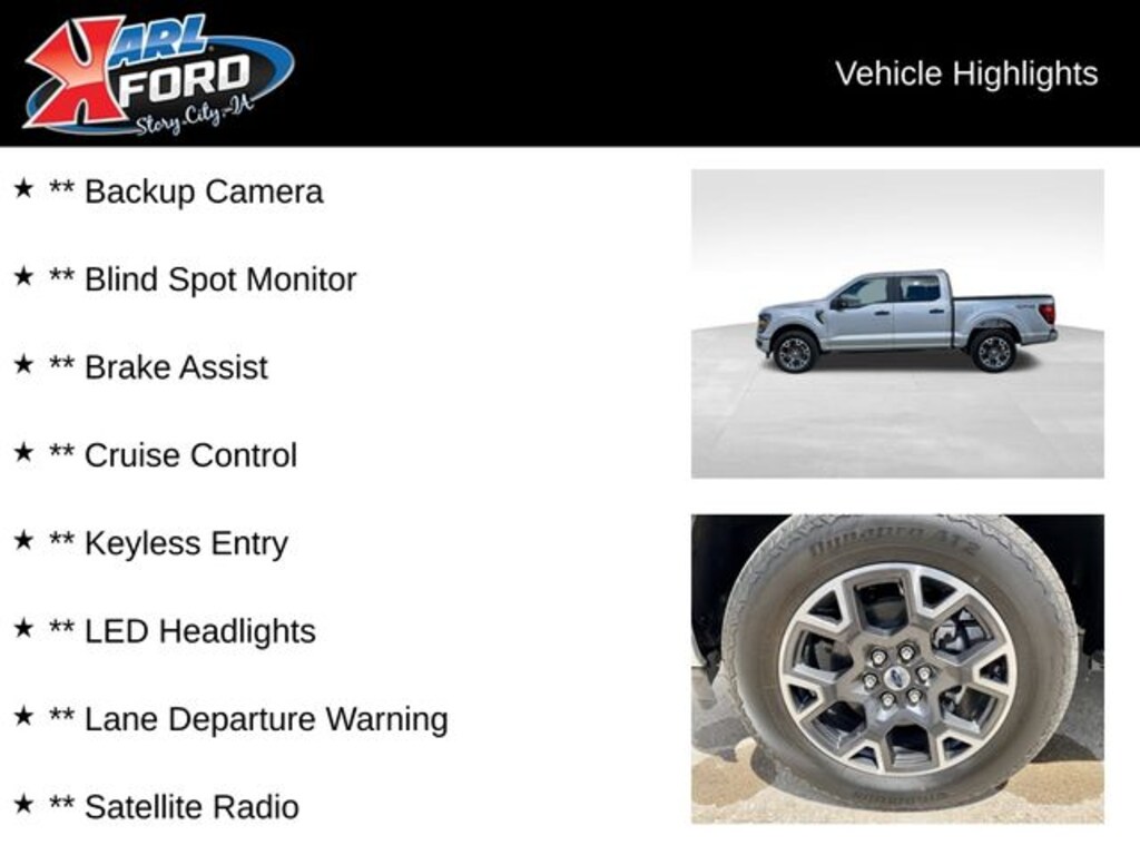 This 2025 Ford F-150 comes equipped with, ** Backup Camera, ** Blind Spot Monitor, ** Brake Assist, ** Cruise Control, ** Keyless Entry, ** LED Headlights, ** Lane Departure Warning, ** Satellite Radio, ** Stability Control, ** WiFi Hotspot, F-150 STX, 4D SuperCrew, 2.7L V6 EcoBoost, 10-Speed Automatic, 4WD, Silver Metallic, Black Cloth, 3.55 Axle Ratio, 4-Wheel Disc Brakes, 6 Speakers, ABS brakes, Air Conditioning, Auto High-beam Headlights, Brake assist, Bumpers: body-color, Compass, Delay-off headlights, Driver door bin, Dual front impact airbags, Dual front side impact airbags, Electronic Stability Control, Emergency communication system: SYNC 4 911 Assist, Equipment Group 200A Mid, Front anti-roll bar, Front Bucket Seats, Front Center Armrest, Front License Plate Bracket, Front reading lights, Front wheel independent suspension, Fully automatic headlights, GVWR: 6,650 lbs Payload Package, Heated door mirrors, Illuminated entry, LED Fog Lamps w/LED Cornering Lamp, Low tire pressure warning, Occupant sensing airbag, Outside temperature display, Overhead airbag, Overhead console, Panic alarm, Passenger door bin, Passenger vanity mirror, Power door mirrors, Power steering, Power windows, Radio data system, Rear Parking Sensors, Rear step bumper, Rear window defroster, Remote keyless entry, Security system, Speed control, Split folding rear seat, Steering wheel mounted audio controls, SYNC 4 w/Enhanced Voice Recognition, Tachometer, Telescoping steering wheel, Tilt steering wheel, Traction control, Trip computer, Variably intermittent wipers, Voltmeter, Wheels: 20" Dark Gray w/Machined Aluminum.