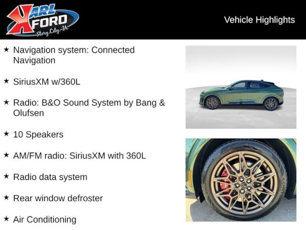 Your Dealer for Life, Karl Ford of Story City. When you buy a new car at Karl Ford of Story City you know you're finding a vehicle you can rely on. We have a great selection of new vehicles for you to test drive around Ames and Des Moines, IA. We also pride ourselves in creating a friendly atmosphere and reliable new car dealership that you can trust. Call us with any questions about our 2025 Ford Mustang Mach-E and our experts will be glad to help you! (515) 733-4364. *Equipment and options are generated by a 3rd party vendor, exact vehicle options may vary. Please see a salesperson for complete details and vehicle information.