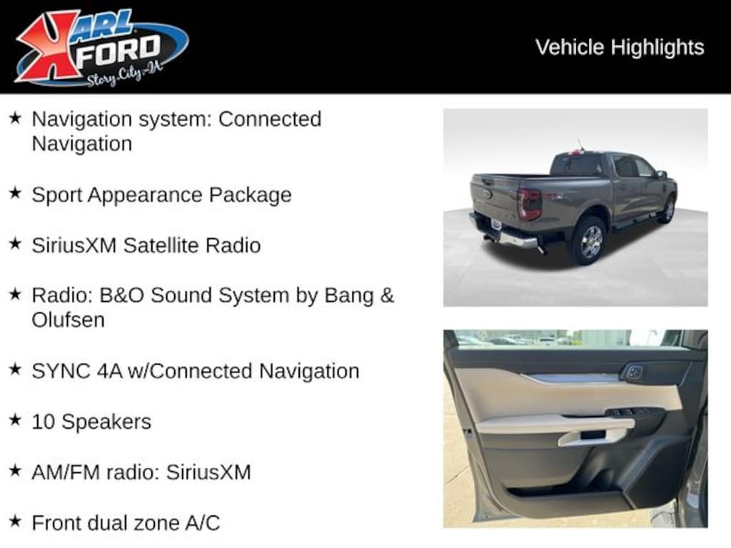 Your Dealer for Life, Karl Ford of Story City. When you buy a new car at Karl Ford of Story City you know you're finding a vehicle you can rely on. We have a great selection of new vehicles for you to test drive around Ames and Des Moines, IA. We also pride ourselves in creating a friendly atmosphere and reliable new car dealership that you can trust. Call us with any questions about our 2025 Ford Ranger and our experts will be glad to help you! (515) 733-4364. *Equipment and options are generated by a 3rd party vendor, exact vehicle options may vary. Please see a salesperson for complete details and vehicle information. Price includes: $2000 - Bonus Customer Cash. Exp. 01/05/2026
