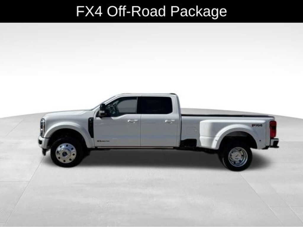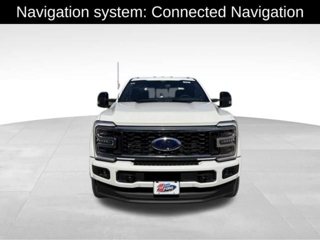 This 2026 Ford F-450SD comes equipped with, F-450SD Platinum, 4D Crew Cab, 6.7L High Output Power Stroke V8 Diesel, 10-Speed Automatic, 4WD, White Metallic, Black Onyx/Platinum Blue, 14 Speakers, 19.5" Forged Polished Aluminum Wheels, 4-Wheel Disc Brakes, 410 Amp Dual Alternators, ABS brakes, Adjustable pedals, Air Conditioning, Alloy wheels, AM/FM radio: SiriusXM with 360L, Auto High-beam Headlights, Auto tilt-away steering wheel, Auto-dimming Rear-View mirror, Automatic temperature control, Brake assist, Bumpers: body-color, Compass, Delay-off headlights, Driver door bin, Driver vanity mirror, Dual front impact airbags, Dual front side impact airbags, Dual rear wheels, Electronic Stability Control, Emergency communication system: SYNC 4 911 Assist, Engine Block Heater, Flow-Through Console, Ford Connectivity Package (1-Year Included), Front anti-roll bar, Front Bucket Seats, Front Center Armrest, Front dual zone A/C, Front fog lights, Front License Plate Bracket, Front reading lights, Front Wheel Well Liners, Fully automatic headlights, FX4 Off-Road Package, Garage door transmitter, GVWR: 14,000 lb Payload Package, Heads-Up Display, Heated door mirrors, Heated front seats, Heated rear seats, Heated steering wheel, Hill Descent Control, Illuminated entry, Internet access capable: 5G Modem - Ford Connectivity Package, Leather steering wheel, Limited Slip w/4.30 Axle Ratio, Low tire pressure warning, Memory seat, Navigation system: Connected Navigation, Off-Road Specifically Tuned Shock Absorbers, Order Code 773A, Outside temperature display, Overhead airbag, Overhead console, Panic alarm, Passenger door bin, Passenger vanity mirror, Pedal memory, Power door mirrors, Power driver seat, Power passenger seat, Power steering, Power windows, Radio: B&O Unleashed Sound System by Bang & Olufsen, Rain sensing wipers, Rapid-Heat Supplemental Cab Heater, Rear anti-roll bar, Rear reading lights, Rear seat center armrest, Rear step bumper, Rear window defroster, Remote keyless entry, Security system, SiriusXM w/360L, Snow Plow Prep Package, Speed control, Split folding rear seat, Steering wheel memory, Steering wheel mounted A/C controls, Steering wheel mounted audio controls, SYNC 4 w/Enhanced Voice Recognition, Tachometer, Telescoping steering wheel, Tilt steering wheel, Tough Bed Spray-In Bedliner, Traction control, Trip computer, Turn signal indicator mirrors, Unique FX4 Off-Road Box Decal, Unique Platinum Leather 40/Console/40 Seats, Upfitter Switches (6), Variably intermittent wipers, Ventilated front seats.