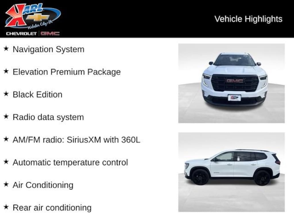 FWD, After Dark Cloth, 18 x 7.5 Aluminum Wheels, 3-Channel Programmable Universal Home Remote, 3rd row seats: split-bench, 4-Way Manual Front Passenger Seat Adjuster, 6-Way Power Front Passenger Seat Adjuster, 7-Passenger Seating (2-2-3 Seating Configuration), 8-Way Power Driver Seat Adjuster, ABS brakes, Air Conditioning, AM/FM radio: SiriusXM with 360L, Apple CarPlay/Android Auto, Auto-Dimming Inside Rear-View Mirror, Auto-dimming Rear-View mirror, Automatic temperature control, Black Edition, Bodyside moldings, Brake assist, CoreTec Seat Trim, Driver door bin, Dual front impact airbags, Electronic Stability Control, Elevation Premium Package, Exterior Parking Camera Rear, Front anti-roll bar, Front Passenger Power Lumbar Seat Adjuster, Front reading lights, Gloss Black Roof Rails, Heated front seats, Heated steering wheel, Navigation System, Occupant sensing airbag, Overhead console, Performance Suspension, Power driver seat, Power Liftgate, Power windows, Radio data system, Rear air conditioning, Rear reading lights, Rear seat center armrest, Rear window wiper, Remote keyless entry, Turn signal indicator mirrors, Wheels: 20 x 8 Bright Silver Aluminum, Wheels: 22 x 8.5 Gloss Black Aluminum. Summit White 2025 GMC Acadia Elevation 4D Sport Utility 2.5L DOHC 20/27 City/Highway MPG 8-Speed Automatic FWD