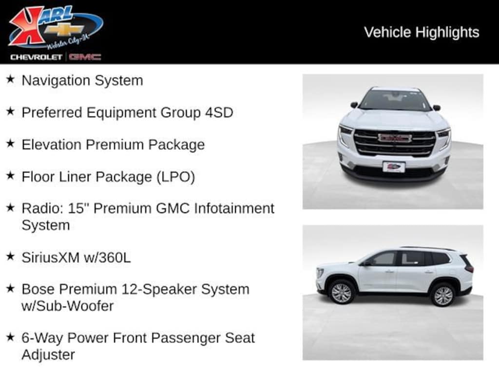 Step inside the Acadia Elevation and you'll be greeted by a spacious and well-appointed interior. The Elevation Premium Package and Preferred Equipment Group 4SD offer a host of premium features, including a Bose premium sound system, heated front seats, and a power liftgate. The 7-passenger seating configuration provides ample room for you and your loved ones, while the split-folding rear seats offer versatile cargo space for all your belongings.