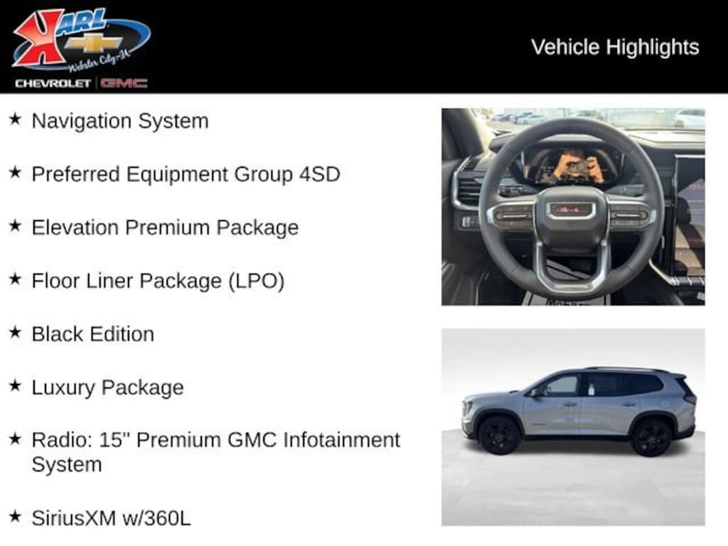 Elevate your driving experience with the 2026 GMC Acadia Elevation. The spacious 7-passenger cabin, split-folding rear seats, and all-weather floor liners make this SUV perfect for your growing family or active lifestyle. The premium Bose audio system and panoramic sunroof will elevate every journey.
