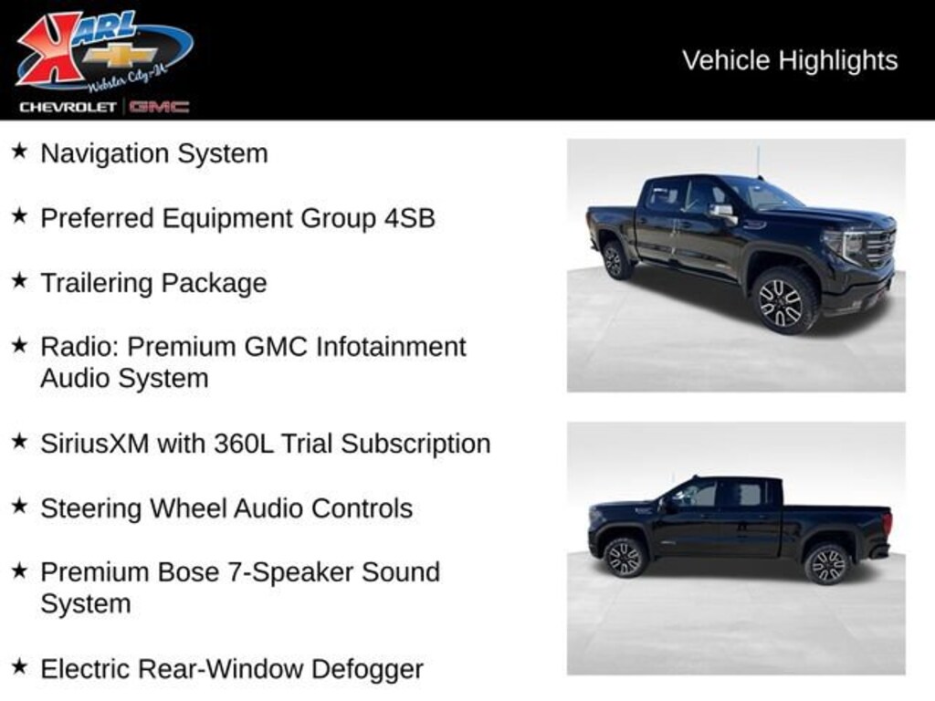 At Karl Chevrolet/GMC we want to help you find the best new or used car in Webster City that suits your needs. When you buy a new car at Karl Chevrolet/GMC you know you're finding a vehicle you can rely on. We have a great selection of CarBravo Quality Pre-Owned Vehicles. We also pride ourselves in creating a friendly atmosphere and a reliable Dealership that you can trust. Call us and our experts will be glad to help you! (515) 209-7117. *Equipment and options are generated by a 3rd party vendor, exact vehicle options may vary. Please see a salesperson for complete details and vehicle information. Price includes: $1750 - Buick & GMC Consumer Cash Program. Exp. 03/31/2026 $500 - Buick GMC Bonus Cash. Exp. 03/31/2026