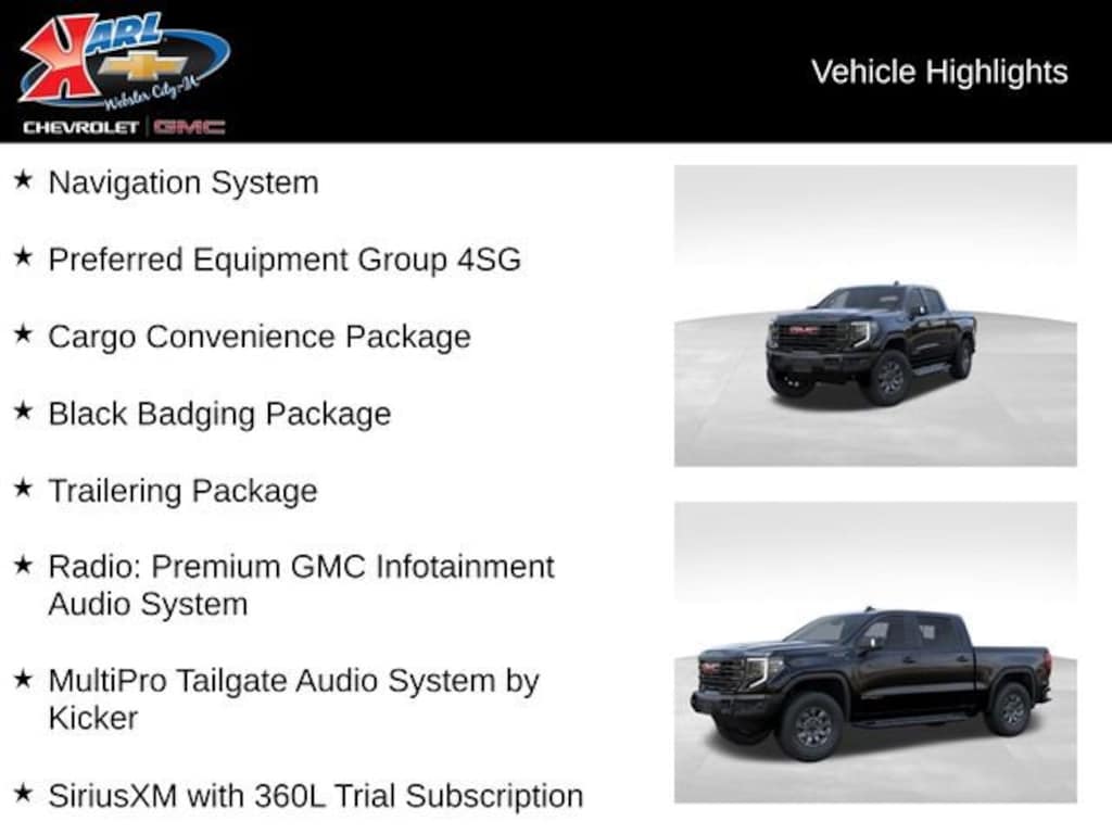 At Karl Chevrolet/GMC, we want to help you find the best new or used car in Webster City that suits your needs. When you buy a new car at Karl Chevrolet/GMC, you know you're finding a vehicle you can rely on. We have a great selection of CarBravo Quality Pre-Owned Vehicles. We also pride ourselves in creating a friendly atmosphere and a reliable Dealership that you can trust. Call us and our experts will be glad to help you! (515) 209-7117. *Equipment and options are generated by a 3rd party vendor, exact vehicle options may vary. Please see a salesperson for complete details and vehicle information. Price includes: $1500 - Buick GMC Bonus Cash. Exp. 04/30/2026 $1750 - Buick & GMC Consumer Cash Program. Exp. 04/30/2026