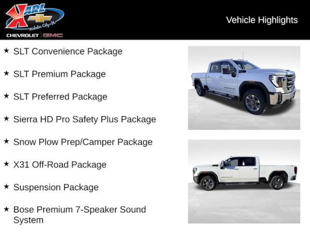 10-Speed Automatic, 4WD, Jet Blk Perforated Lth-Ap Leather, 120-Volt Instrument Panel Power Outlet, 2 Charge-Only Rear USB Ports, 2 Charge/Data USB Ports, 2 Charge/Data USB Ports Inside Center Console, 220-Amp Alternator, 6 Speakers, 6-Speaker Audio System Feature, 6 Rectangular Chromed Tubular Assist Steps, Adaptive Cruise Control, Air Conditioning, AM/FM radio: SiriusXM with 360L, Apple CarPlay/Android Auto, Auto-dimming Rear-View mirror, Bose Premium 7-Speaker Sound System, Deep-Tinted Glass, Driver door bin, Driver Memory, Driver vanity mirror, Dual front side impact airbags, Electric Rear-Window Defogger, Electronic Stability Control, Floor-Mounted Center Console, Following Distance Indicator, Forward Collision Alert, Front 40/20/40 Split-Bench Seats, Front anti-roll bar, Front Bucket Seats, Front dual zone A/C, Front fog lights, Front Rain-Sensing Wipers, HD Surround Vision, Heated 2nd Row Outboard Seats, Heated front seats, Heated steering wheel, Hill Descent Control, Lane Departure Warning System, LED Cargo Area Lighting, LED Smoked Amber Roof Marker Lamps, Memory seat, Occupant sensing airbag, Off-Road Suspension, OnStar Services Capable, Outside temperature display, Pickup Box, Power driver seat, Power Sunroof, Power windows, Push Button Start, Rain sensing wipers, Rear Cross Traffic Alert, Rear reading lights, Rear seat center armrest, Rear window defroster, Remote keyless entry, Safety Alert Seat, Sierra HD Pro Safety Plus Package, SLT Convenience Package, SLT Preferred Package, SLT Premium Package, Snow Plow Prep/Camper Package, Steering wheel mounted audio controls, Suspension Package, Trailer Side Blind Zone Alert, Universal Home Remote, Wireless Charging, Wireless Phone Projection, X31 Off-Road Package. White 2026 GMC Sierra 2500HD SLT 4D Crew Cab 6.6L V8 10-Speed Automatic 4WD
