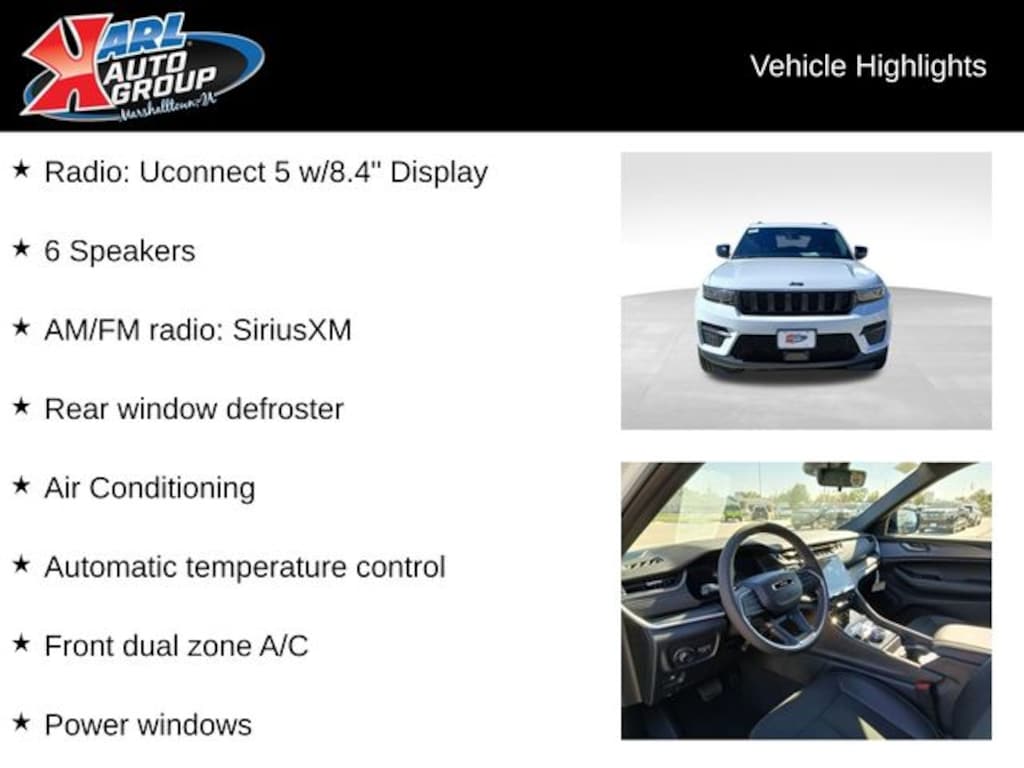When you buy a new car at Karl or Marshalltown you know you're finding a vehicle you can rely on. We have a great selection of new vehicles for you to test drive around Newton and Des Moines, IA. We also pride ourselves in creating a friendly atmosphere and reliable new car dealership that you can trust. Call us with any questions about our 2025 Jeep Grand Cherokee and our experts will be glad to help you! (641) 752-7101. *Equipment and options are generated by a 3rd party vendor, exact vehicle options may vary. Please see a salesperson for complete details and vehicle information.