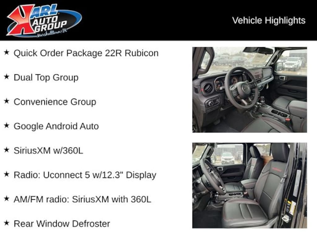 12.3" Touchscreen Display, 4G LTE Wi-Fi Hot Spot, Air Conditioning, AM/FM radio: SiriusXM with 360L, Automatic temperature control, Brake assist, Compass, Connectivity - US/Canada, Convenience Group, Driver door bin, Dual front side impact airbags, Dual Top Group, Electronic Stability Control, Emergency communication system: Jeep Connect, Engine Oil Cooler, For More Info, Call 800-643-2112, Front dual zone A/C, Google Android Auto, Heated Front Seats, Heated Steering Wheel, Illuminated entry, Integrated roll-over protection, Low tire pressure warning, Outside temperature display, Overhead airbag, ParkView Rear Back-Up Camera, Power windows, Quick Order Package 22R Rubicon, Rear Window Defroster, Rear Window Wiper/Washer, Remote Start System, SiriusXM Radio Service, Steering wheel mounted audio controls, Stop-Start Dual Battery System, Tilt steering wheel, Universal Garage Door Opener, Wheels: 17" x 7.5" Machined/Painted Black.