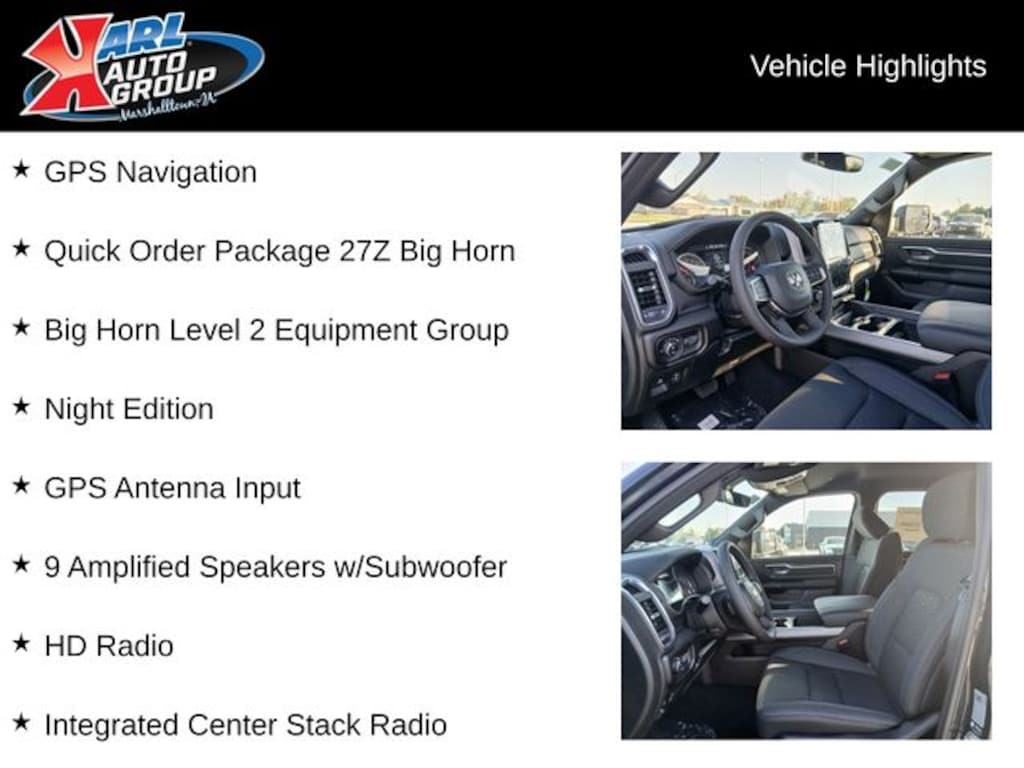 When you buy a new car at Karl or Marshalltown you know you're finding a vehicle you can rely on. We have a great selection of new vehicles for you to test drive around Newton and Des Moines, IA. We also pride ourselves in creating a friendly atmosphere and reliable new car dealership that you can trust. Call us with any questions about our 2026 Ram 1500 and our experts will be glad to help you! (641) 752-7101. *Equipment and options are generated by a 3rd party vendor, exact vehicle options may vary. Please see a salesperson for complete details and vehicle information. Price includes: $3500 - 2026 National Retail Consumer Cash . Exp. 11/03/2025