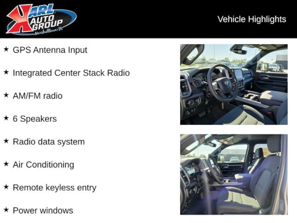 When you buy a new car at Karl or Marshalltown you know you're finding a vehicle you can rely on. We have a great selection of new vehicles for you to test drive around Newton and Des Moines, IA. We also pride ourselves in creating a friendly atmosphere and reliable new car dealership that you can trust. Call us with any questions about our 2026 Ram 1500 and our experts will be glad to help you! (641) 752-7101. *Equipment and options are generated by a 3rd party vendor, exact vehicle options may vary. Please see a salesperson for complete details and vehicle information. Price includes: $3500 - 2026 National Retail Consumer Cash . Exp. 03/02/2026