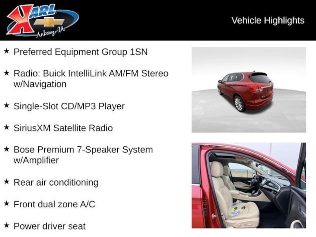 Certification Program Details: Karl Chevrolet of Ankeny, The Nation's #1 CarBravo Certified Dealer! Every CarBravo Certified vehicle includes: Comprehensive 126-Point Inspection Professionally inspected by factory-trained technicians to meet strict mechanical, safety, and cosmetic standards. 12-Month / 12,000-Mile Bumper-to-Bumper Limited Warranty Enjoy added peace of mind with extensive coverage from the day you drive off the lot. 24/7 Roadside Assistance & Courtesy Transportation Flat tire? Dead battery? Need a tow? You're covered anywhere, anytime throughout the warranty period. Vehicle History & Title Guarantee Clean title, completed safety recalls, and a full CARFAX® or AutoCheck® report provided for complete transparency. 10-Day / 500-Mile Exchange Promise If you don't absolutely love it, bring it back and exchange it no hassle, no stress. Experience peace of mind and premium protection exclusively from Karl Chevrolet of Ankeny, the Nation's #1 CarBravo Dealer!- MOONROOF, POWER, OVERSIZED, TILT-SLIDING- AUDIO SYSTEM, BUICK INTELLILINK RADIO WITH NAVIGATION, AM/FM/SIRIUSXM STEREO AND CD/MP3 PLAYER- Saffron Red Metallic- Preferred Equipment Group 1SNThis 2016 Buick Envision Premium I delivers an exceptional blend of style, comfort, and performance. Powered by a robust 2.0L 4-Cylinder DGI DOHC VVT Turbocharged engine mated to a smooth-shifting 6-Speed Automatic transmission, this AWD crossover provides a dynamic and confident driving experience. With an impressive 20 city/26 highway MPG, you'll enjoy excellent fuel efficiency for your daily commute or weekend adventures.The stunning Saffron Red Metallic exterior exudes a sophisticated and refined presence, while the spacious and well-appointed interior offers a wealth of premium features. Indulge in the comfort of the Bose Premium 7-Speaker System, stay connected with the Buick IntelliLink infotainment system with navigation, and enjoy the convenience of the power panoramic moonroof. Safety is also a top priority, with advanced driver-assist technologies like the Lane Departure Warning System and Rear Parking Camera keeping you and your loved ones secure on the road.This Buick Envision Premium I has been meticulously inspected and certified through our exclusive CarBravo program. You can drive with confidence, knowing that this vehicle has undergone a comprehensive 126-point inspection, is backed by a 12-month/12,000-mile limited warranty, and comes with 24/7 roadside assistance and a vehicle history guarantee. Experience the peace of mind and premium protection that only Karl Chevrolet of Ankeny, the Nation's #1 CarBravo Dealer, can provide.Don't miss your chance to own this exceptional 2016 Buick Envision Premium I. Schedule a test drive today and discover the perfect combination of style, technology, and performance that this certified pre-owned crossover has to offer. Our knowledgeable sales team is here to assist you in finding the ideal vehicle to meet your needs and exceed your expectations.At Karl Chevrolet we want to help you find the best new or used car in Ankeny that suits your needs. When you buy a new car at Karl Chevrolet you know you're finding a vehicle you can rely on. We have a great selection of Platinum Quality Pre-Owned Vehicles. We also pride ourselves in creating a friendly atmosphere and a reliable Dealership that you can trust. Call us and our experts will be glad to help you! (515) 299-4300. *Equipment and options are generated by a 3rd party vendor, exact vehicle options may vary. Please see a salesperson for complete details and vehicle information.