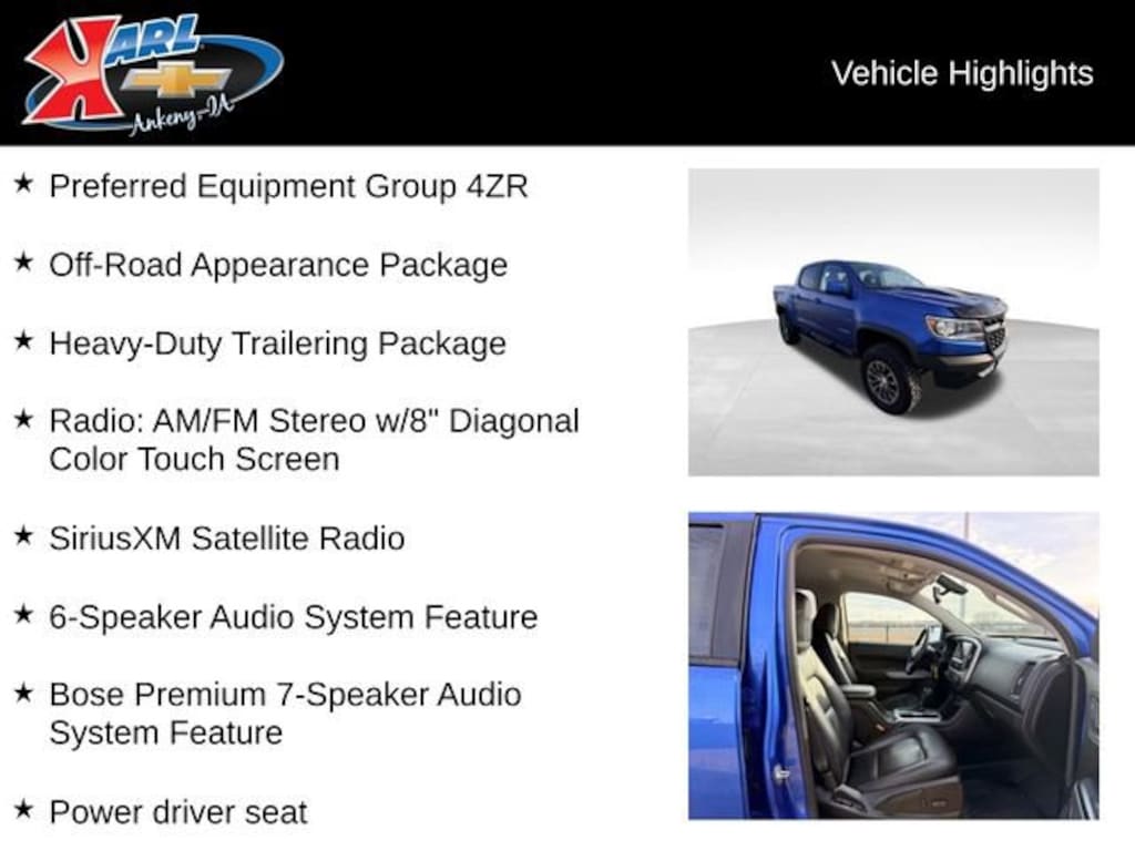 Inside, you'll find a well-appointed cabin with premium amenities like a Bose premium audio system, heated front seats, and an 8-inch touchscreen infotainment display with Apple CarPlay. The crew cab configuration provides ample room for passengers and cargo, making this Colorado a versatile choice for both work and play.