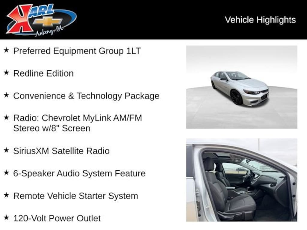 Certification Program Details: Karl Chevrolet of Ankeny, The Nation's #1 CarBravo Certified Dealer! Every CarBravo Certified vehicle includes: Comprehensive 126-Point Inspection Professionally inspected by factory-trained technicians to meet strict mechanical, safety, and cosmetic standards. 12-Month / 12,000-Mile Bumper-to-Bumper Limited Warranty Enjoy added peace of mind with extensive coverage from the day you drive off the lot. 24/7 Roadside Assistance & Courtesy Transportation Flat tire? Dead battery? Need a tow? You're covered anywhere, anytime throughout the warranty period. Vehicle History & Title Guarantee Clean title, completed safety recalls, and a full CARFAX® or AutoCheck® report provided for complete transparency. 10-Day / 500-Mile Exchange Promise If you don't absolutely love it, bring it back and exchange it no hassle, no stress. Experience peace of mind and premium protection exclusively from Karl Chevrolet of Ankeny, the Nation's #1 CarBravo Dealer!- Redline Edition- Convenience & Technology Package- Preferred Equipment Group 1LT- Power Tilt-Sliding Sunroof- Wireless Charging For Devices- Wheels: 19 Black-Painted Alum w/Red Hash Marks- Apple CarPlay/Android Auto- Leather-Wrapped Shift Knob- Inside Rear-View Auto-Dimming Mirror- Dual USB Charging-Only Ports- Driver Information System w/Color Display- Remote Vehicle Starter System- Universal Home Remote- Power driver seat- SiriusXM Satellite Radio- Radio: Chevrolet MyLink AM/FM Stereo w/8 ScreenThis 2018 Chevrolet Malibu LT 4DR SDN LT W/1LT is a stylish and well-equipped midsize sedan that combines sleek design, advanced technology, and impressive efficiency. With its striking Redline Edition styling, including a blacked-out grille, black exterior accents, and bold 19-inch wheels, this Malibu stands out from the crowd. Under the hood, the 1.5-liter DOHC engine delivers a responsive and fuel-efficient driving experience, with an EPA-estimated 27 city/36 highway MPG.Inside, the Malibu LT offers a wealth of premium features to enhance your driving enjoyment. The Convenience and Technology Package adds conveniences like remote start, auto-dimming rearview mirror, and wireless charging, while the Chevrolet MyLink infotainment system with an 8-inch touchscreen provides seamless smartphone integration through Apple CarPlay and Android Auto. Settle into the comfortable, power-adjustable driver's seat and enjoy the premium sound of the 6-speaker audio system with SiriusXM satellite radio.This Malibu is also part of the CarBravo Certified program, ensuring you can purchase with confidence. Every CarBravo Certified vehicle undergoes a comprehensive 126-point inspection, comes with a 12-month/12,000-mile bumper-to-bumper warranty, and includes 24/7 roadside assistance and a 10-day/500-mile exchange promise. With its exceptional combination of style, technology, and peace of mind, this 2018 Chevrolet Malibu LT is an exceptional value that's sure to impress.At Karl Chevrolet we want to help you find the best new or used car in Ankeny that suits your needs. When you buy a new car at Karl Chevrolet you know you're finding a vehicle you can rely on. We have a great selection of Platinum Quality Pre-Owned Vehicles. We also pride ourselves in creating a friendly atmosphere and a reliable Dealership that you can trust. Call us and our experts will be glad to help you! (515) 299-4300. *Equipment and options are generated by a 3rd party vendor, exact vehicle options may vary. Please see a salesperson for complete details and vehicle information.