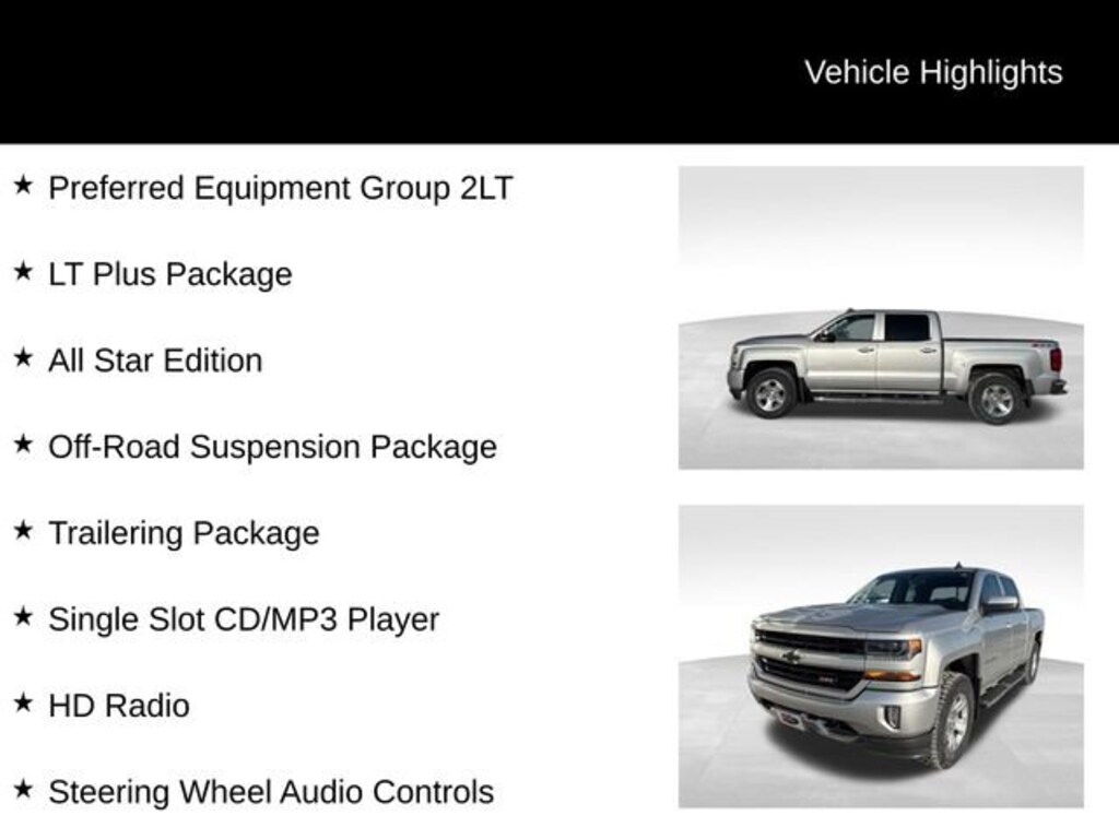 Certified.Silver Ice Metallic LT 4WD EcoTec3 5.3L V8110-Volt AC Power Outlet, 150 Amp Alternator, 4.2 Diagonal Color Display Driver Info Center, 6 Speaker Audio System, All Star Edition, Bluetooth® For Phone, Body Color Bodyside Moldings, Body Color Rear Bumper w/Cornersteps, Body-Color Door Handles, Body-Color Grille Surround, Body-Color Headlamp Bezels, Body-Color Mirror Caps, Body-Color Power Adjustable Heated Outside Mirrors, Chevrolet Connected Access, Chevrolet w/4G LTE, Color-Keyed Carpeting w/Rubberized Vinyl Floor Mats, Deep-Tinted Glass, Driver & Front Passenger Illuminated Vanity Mirrors, Dual-Zone Automatic Climate Control, Electric Rear-Window Defogger, EZ Lift & Lower Tailgate, Front Body-Color Bumper, Front Chrome Bumper, Front Frame-Mounted Black Recovery Hooks, HD Radio, Heavy-Duty Rear Locking Differential, Hill Descent Control, Leather Wrapped Steering Wheel w/Cruise Controls, LT Plus Package, Manual Tilt Wheel Steering Column, Off-Road Suspension Package, OnStar & Chevrolet Connected Services Capable, Power Adjustable Pedals, Power Sliding Rear Window, Power Windows w/Driver Express Up, Preferred Equipment Group 2LT, Rear 60/40 Folding Bench Seat (Folds Up), Rear Chrome Bumper, Rear Wheelhouse Liners, Remote Keyless Entry, Remote Locking Tailgate, Remote Vehicle Starter System, Single Slot CD/MP3 Player, Steering Wheel Audio Controls, Theft Deterrent System (Unauthorized Entry), Thin Profile LED Fog Lamps, Trailering Package, Ultrasonic Rear Park Assist, Universal Home Remote.Here at Karl Chevrolet of Stuart we want to help you find the best vehicle to suit your needs. With our huge selection of new and pre-owned vehicles, we're sure to have the right car for you! We pride ourselves on creating a friendly buying experience and earning the title of Your Dealer for Life. Give us a call at 515.523.1201 and speak to our experts to find out just how easy it is to get the vehicle of your dreams!*Equipment and options are generated by a 3rd party vendor, exact vehicle options may vary. Please see a salesperson for complete details and vehicle information.Odometer is 19189 miles below market average!Certification Program Details: Karl Chevrolet of Stuart, your newest CarBravo dealer, where platinum quality vehicles and unmatched benefits come together! -Comprehensive Limited Bumper to Bumper Warranty. -24/7 Roadside Assistance: -Multi-Point Vehicle Inspection: Every vehicle undergoes a Platinum Quality Certified Inspection known throughout the industry to ensure top quality. -Vehicle Exchange Program. Within 10-Days and 500 miles -Complimentary Vehicle History Report -Nationwide Dealer Network Support: Enjoy the backing of the extensive CarBravo and GM dealership network. -OnStar and SiriusXM Trials: Enjoy connected services and entertainment with included trial subscriptions. -Terms and conditions may apply. With every vehicle purchased, you'll enjoy the peace of mind that comes with a limited warranty, 24/7 roadside assistance, and a comprehensive vehicle inspection.Awards:* 2018 KBB.com 10 Most Awarded Brands