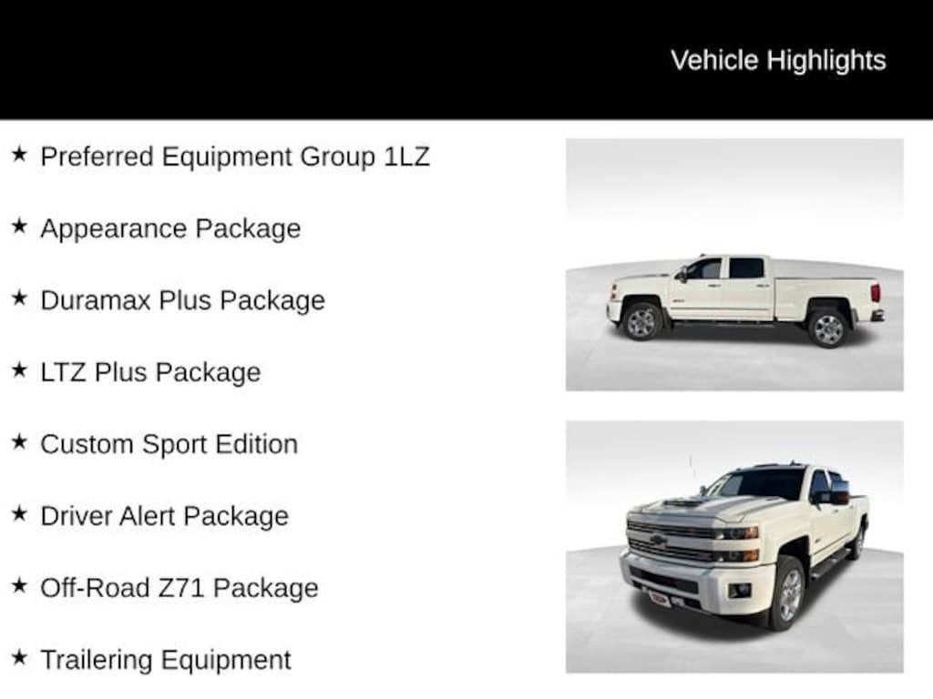 This 2018 Chevrolet Silverado 2500HD LTZ is a true workhorse, packed with premium features and capabilities that will elevate your driving experience. Powered by the renowned Duramax 6.6L V8 Turbodiesel engine paired with the reliable Allison 1000 6-speed automatic transmission, this truck delivers unparalleled towing and hauling performance. The 4-wheel-drive system ensures confident handling and control, even in the most challenging conditions.