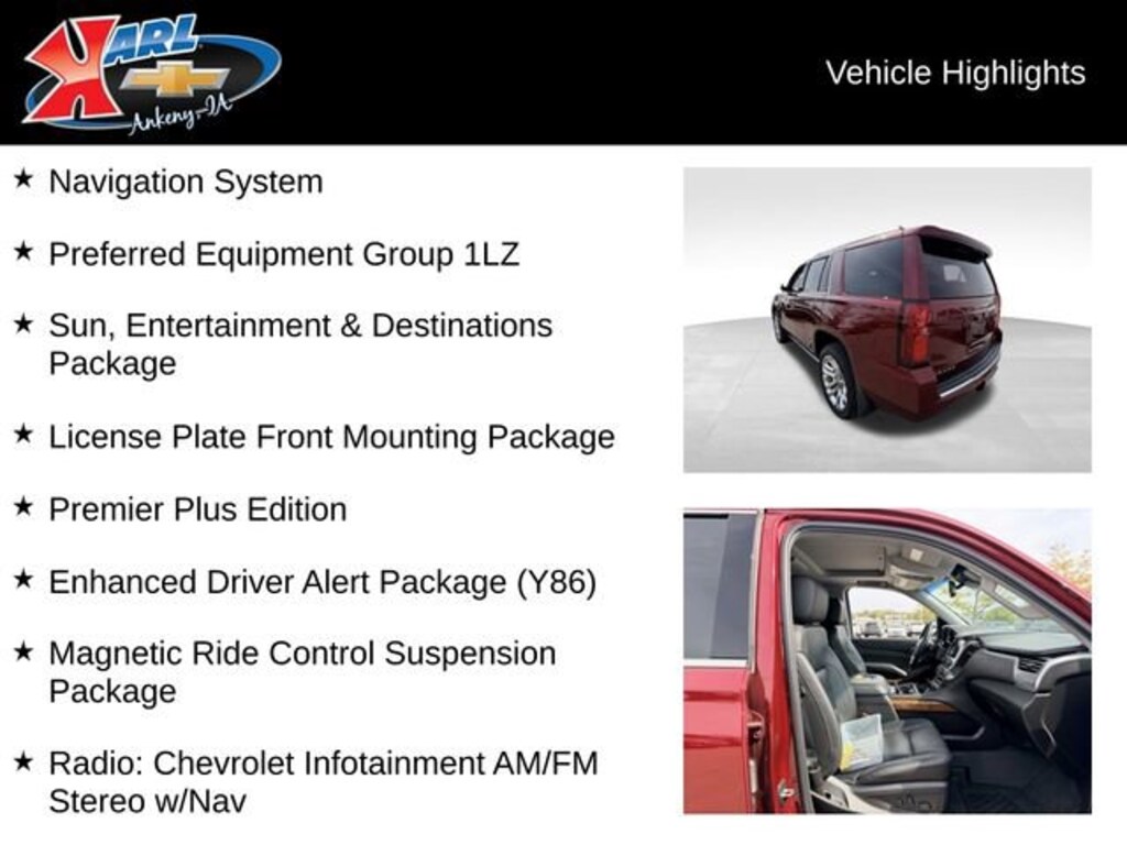 Recent Arrival! Clean CARFAX. Local Trade & Sold New at Karls! Equipped With Power Running Boards, Mud Flaps & 22 Inch Chrom Factory Wheels! Certified. Siren Red Tintcoat 2019 Chevrolet Tahoe Premier 4DR 4WD EcoTec3 6.2L V8 4WD, Jet Black / Mahogany Leather, 170 Amp Alternator, 1st & 2nd Row Color-Keyed Carpeted Floor Mats, 3.23 Rear Axle Ratio, 3rd Row 60/40 Power Fold Split-Bench, 4-Wheel Antilock Disc Brakes w/Brake Assist, 5 12-Volt Auxiliary Power Outlets, Adjustable pedals, Apple CarPlay/Android Auto, Auto High-beam Headlights, Auto-Dimming Inside Rear-View Mirror, Black Assist Steps w/Chrome Accent Strip, Black Roof Rack Cross Rails, Bluetooth® For Phone, Bose Centerpoint Premium 10-Speaker Surround Sound, Cargo Net, Collapsible Cargo Area Organizer (LPO), Color-Keyed Carpeting Floor Covering, Driver Inboard & Front Passenger Airbags, Electronic Cruise Control w/Set & Resume Speed, Enhanced Driver Alert Package (Y86), Enhanced Driver Information Center, Exterior Parking Camera Rear, Floor Console, Fog Lamps, Forward Collision Alert, Front & Rear Park Assist, Front dual zone A/C, Hands Free Power Liftgate, HD Radio, Head-Up Display, Heated & Ventilated Driver & Front Passenger Seats, Heated 2nd Row Seats, Heated Leather Wrapped Steering Wheel, Integrated Trailer Brake Controller, IntelliBeam Headlamps, Lane Change Alert w/Side Blind Zone Alert, Lane Keep Assist w/Lane Departure Warning, License Plate Front Mounting Package, Low Speed Forward Automatic Braking, Magnetic Ride Control Suspension Package, Memory Settings, Navigation System, Passive Entry System, Pedal memory, Polished Exhaust Tip, Power driver seat, Power Release 2nd Row Bucket Seats, Power Sunroof, Power Tilt & Telescopic Steering Column, Power-Adjustable Accelerator & Brake Pedals, Power-Folding Heated Outside Mirrors, Power-Retractable Assist Steps, Preferred Equipment Group 1LZ, Premier Plus Edition, Push Button Keyless Start, Radio: Chevrolet Infotainment AM/FM Stereo w/Nav, Rain sensing wipers, Rear air conditioning, Rear Cross Traffic Alert, Rear Seat Blu-Ray/DVD Entertainment System, Remote Keyless Entry, Remote Vehicle Start, Roof-Mounted Luggage Rack Side Rails, Single-Slot CD/MP3 Player, SiriusXM NavTraffic, SiriusXM Radio, Sun, Entertainment & Destinations Package, Universal Home Remote, Wireless Charging. 14/22 City/Highway MPG 10-Speed Automatic with Overdrive 4WDCertification Program Details: Karl Chevrolet of Ankeny, your newest CarBravo dealer, where platinum quality vehicles and unmatched benefits come together! -Comprehensive Limited Bumper to Bumper Warranty. -24/7 Roadside Assistance: -Multi-Point Vehicle Inspection: Every vehicle undergoes a Platinum Quality Certified Inspection known throughout the industry to ensure top quality. -Vehicle Exchange Program. Within 10-Days and 500 miles -Complimentary Vehicle History Report -Nationwide Dealer Network Support: Enjoy the backing of the extensive CarBravo and GM dealership network. -OnStar and SiriusXM Trials: Enjoy connected services and entertainment with included trial subscriptions. -Terms and conditions may apply. With every vehicle purchased, you'll enjoy the peace of mind that comes with a limited warranty, 24/7 roadside assistance, and a comprehensive vehicle inspection.