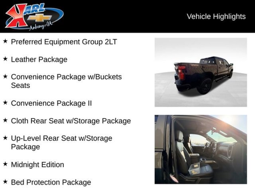 Recent Arrival! Clean CARFAX. Local Trade! Equipped With Bed Liner, Tonneau Cover & 20 Inch Black Fuel Wheels! Certified. Black 2021 Chevrolet Silverado 1500 LT Trail Boss 4WD CREW 147 EcoTec3 6.2L V8 10-Speed Automatic, 4WD, Black Leather, 170 Amp Alternator, 2 USB Ports, 2 USB Ports (First Row), 4G LTE Wi-Fi Hot Spot Capable, 6-Speaker Audio System, Auto-Locking Rear Differential, Auxiliary External Transmission Oil Cooler, Bed Protection Package, Black Dual Exhaust Tips, Bluetooth® For Phone, Cloth Rear Seat w/Storage Package, Convenience Package II, Convenience Package w/Buckets Seats, Deep-Tinted Glass, Dual Exhaust w/Polished Outlets, Dual-Zone Automatic Climate Control, Electric Rear-Window Defogger, Electrical Lock Control Steering Column, Electronic Cruise Control, EZ Lift Power Lock & Release Tailgate, Floor Mounted Center Console, Front LED Fog Lamps, HD Radio, HD Rear Vision Camera, Heated Driver & Front Outboard Passenger Seats, Heated Steering Wheel, Heavy-Duty Air Filter, High Gloss Black Grille, High Gloss Black Mirror Caps, Hill Descent Control, Hitch Guidance, Integrated Trailer Brake Controller, Keyless Open & Start, Leather Package, Leather Wrapped Steering Wheel, Leather-Appointed Front Seat Trim, LED Cargo Area Lighting, LED Reflector Headlamps, LED Reflector High Intensity Headlamps, Manual Tilt/Telescoping Steering Column, Midnight Edition, OnStar & Chevrolet Connected Services Capable, Performance Red Recovery Hooks, Power Door Locks, Power driver seat, Power Sliding Rear Window w/Rear Defogger, Power windows, Preferred Equipment Group 2LT, Premium Bose 7-Speaker Sound System, Radio: Chevrolet Infotainment 3 Plus System, Rear Dual USB Charging-Only Ports, Rear Vision Camera, Rear Wheelhouse Liners, Remote Vehicle Starter System, SiriusXM Radio, Standard Tailgate, Steering Wheel Audio Controls, Suspension Package, Theft Deterrent System (Unauthorized Entry), Trailering Package, Universal Home Remote, Up-Level Rear Seat w/Storage Package, Wheels: 20 x 9 High Gloss Black Painted Alum, Wireless Phone Projection. 15/19 City/Highway MPG 10-Speed Automatic 4WD