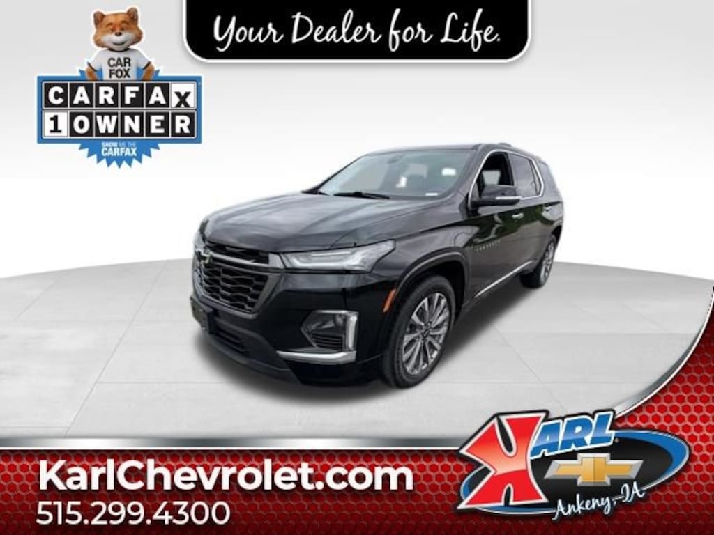 Recent Arrival! CARFAX One-Owner. Clean CARFAX. Black Metallic 2022 Chevrolet Traverse Premier 4DR AWD 3.6L V6 SIDI VVT AWD. 17/25 City/Highway MPG 9-Speed Automatic AWDAt Karl Chevrolet we want to help you find the best new or used car in Ankeny that suits your needs. Check out the 2022 Chevrolet Traverse For Sale in Ankeny, IA. When you buy a new car at Karl Chevrolet you know you're finding a vehicle you can rely on. We have a great selection of Platinum Quality Pre-Owned Vehicles. We also pride ourselves in creating a friendly atmosphere and reliable new car dealership that you can trust. Call us with any questions about our 2022 Chevrolet Traverse and our experts will be glad to help you! (515) 299-4300. *Equipment and options are generated by a 3rd party vendor, exact vehicle options may vary. Please see a salesperson for complete details and vehicle information.