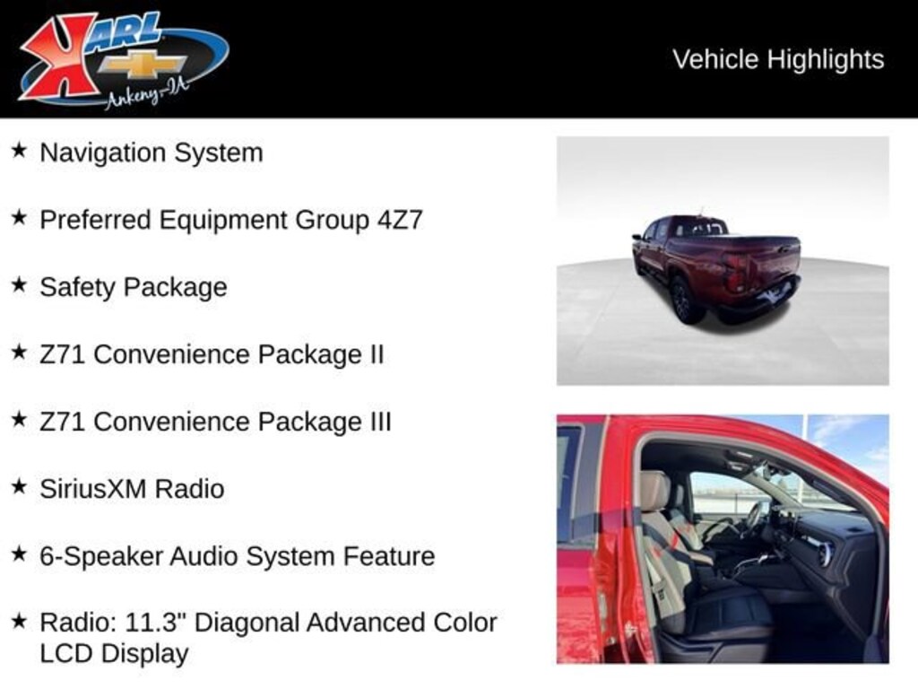 Recent Arrival! CARFAX One Owner, Local Trade & Sold New at Karls! Clean CARFAX. Certified. Radiant Red Tintcoat 2023 Chevrolet Colorado Z71 4WD CREW Z71 2.7L Turbo 4WD, 6-Speaker Audio System Feature, 8-Way Power Driver Seat Adjuster, Apple CarPlay/Android Auto, Auto High-beam Headlights, Automatic Emergency Braking, Blind Zone Steering Assist, Chevy Safety Assist, Driver & Front Passenger Ventilated Seats, Driver Memory Settings, Driver Seatback Map Pocket, Dual-Zone Automatic Air Conditioning, Electronic Automatic Cruise Control, EZ-Lift & Lower Tailgate, Following Distance Indicator, Forward Collision Alert, Front Pedestrian & Bicyclist Braking, Heated Driver & Front Passenger Seats, Heated Steering Wheel, Inside Rear-View Auto-Dimming Mirror, IntelliBeam Automatic High Beam On/Off, Lane Keep Assist w/Lane Departure Warning, Navigation System, Perforated Leather-Appointed Seat Trim, Power Driver Lumbar Control Seat Adjuster, Power windows, Preferred Equipment Group 4Z7, Radio: 11.3 Diagonal Advanced Color LCD Display, Rear Center Armrest, Rear Cross Traffic Braking, Rear Park Assist, Rear-Window Electric Defogger, Remote Vehicle Starter System, Safety Package, SiriusXM Radio, Steering Wheel Mounted Audio Controls, StowFlex Tailgate Storage Compartment, Tailgate Keyed Cylinder Lock, Tilt & Telescoping Steering Column, Wireless Charging, Wireless Phone Projection, Z71 Convenience Package II, Z71 Convenience Package III. 17/21 City/Highway MPG 8-Speed Automatic 4WDAt Karl Chevrolet we want to help you find the best new or used car in Ankeny that suits your needs. Check out the 2023 Chevrolet Colorado For Sale in Ankeny, IA. When you buy a new car at Karl Chevrolet you know you're finding a vehicle you can rely on. We have a great selection of Platinum Quality Pre-Owned Vehicles. We also pride ourselves in creating a friendly atmosphere and reliable new car dealership that you can trust. Call us with any questions about our 2023 Chevrolet Colorado and our experts will be glad to help you! (515) 299-4300. *Equipment and options are generated by a 3rd party vendor, exact vehicle options may vary. Please see a salesperson for complete details and vehicle information.Certification Program Details: Karl Chevrolet of Ankeny, The Nation's #1 CarBravo certified dealer, where platinum quality vehicles and unmatched benefits come together! This vehicle qualifies for our CarBravo Certified program reserved for the highest-quality pre-owned vehicles that are 10 model years or newer and have less than 100,000 miles. Every CarBravo Certified vehicle includes: ? Comprehensive 126-Point Inspection Professionally inspected by factory-trained technicians to meet strict mechanical, safety, and cosmetic standards. ? 6-Month / 6,000-Mile Bumper-to-Bumper Limited Warranty Enjoy added peace of mind with extensive coverage from the day you drive off the lot. ? 24/7 Roadside Assistance & Courtesy Transportation Flat tire? Dead battery? Need a tow? You're covered anywhere, anytime throughout the warranty period. ? Vehicle History & Title Guarantee Clean title, completed safety recalls, and a full CARFAX® or AutoCheck® report provided for complete transparency. ? 10-Day / 500-Mile Exchange Promise If you don't absolutely love it, bring it back and exchange it no hassle, no stress. Experience peace of mind and premium protection exclusively from Karl Chevrolet of Ankeny, the Nation's #1 CarBravo Certified Deale