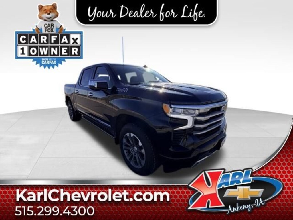 Recent Arrival! CARFAX One-Owner. Black 2023 Chevrolet Silverado 1500 High Country 4WD CREW CAB 147 HI EcoTec3 6.2L V8 10-Speed Automatic, 4WD, Jet Black/Umber Leather. 16/20 City/Highway MPG 10-Speed Automatic 4WDAt Karl Chevrolet we want to help you find the best new or used car in Ankeny that suits your needs. Check out the 2023 Chevrolet Silverado 1500 For Sale in Ankeny, IA. When you buy a new car at Karl Chevrolet you know you're finding a vehicle you can rely on. We have a great selection of Platinum Quality Pre-Owned Vehicles. We also pride ourselves in creating a friendly atmosphere and reliable new car dealership that you can trust. Call us with any questions about our 2023 Chevrolet Silverado 1500 and our experts will be glad to help you! (515) 299-4300. *Equipment and options are generated by a 3rd party vendor, exact vehicle options may vary. Please see a salesperson for complete details and vehicle information.