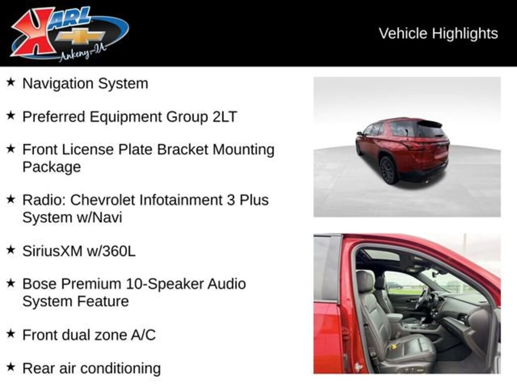 The Traverse RS stands out with its bold, athletic styling cues, including the distinctive black grille, body-color trim, and 20-inch dark aluminum wheels. Step inside and you'll be greeted by a wealth of premium features, from the Bose premium audio system and Chevrolet Infotainment 3 Plus with built-in navigation, to the dual-zone automatic climate control and heated steering wheel. The available Dual SkyScape 2-panel power sunroof adds an extra touch of open-air enjoyment.