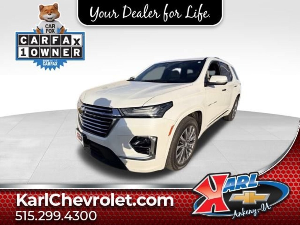 Recent Arrival! CARFAX One-Owner & Local Trade! Certified. Iridescent Pearl Tricoat 2023 Chevrolet Traverse Premier 4DR AWD 3.6L V6 SIDI VVT AWD, 10 Speakers, 3rd row seats: split-bench, Apple CarPlay/Android Auto, Auto High-beam Headlights, Bose Premium 10-Speaker Audio System Feature, Dual SkyScape 2-Panel Power Sunroof, Exterior Parking Camera Rear, Front dual zone A/C, Front License Plate Bracket Mounting Package, Heated 2nd Row Outboard Position Seats, Heated Driver & Front Passenger Seats, Heated steering wheel, Memory seat, Navigation System, Power driver seat, Preferred Equipment Group 1LZ, Radio: Chevrolet Infotainment 3 Plus System w/Navi, Rear air conditioning, SiriusXM w/360L, Steering wheel mounted audio controls, Ventilated Driver & Front Passenger Seats, Wheels: 20 Metallic Machined-Face Aluminum. 17/25 City/Highway MPG 9-Speed Automatic AWDAt Karl Chevrolet we want to help you find the best new or used car in Ankeny that suits your needs. Check out the 2023 Chevrolet Traverse For Sale in Ankeny, IA. When you buy a new car at Karl Chevrolet you know you're finding a vehicle you can rely on. We have a great selection of Platinum Quality Pre-Owned Vehicles. We also pride ourselves in creating a friendly atmosphere and reliable new car dealership that you can trust. Call us with any questions about our 2023 Chevrolet Traverse and our experts will be glad to help you! (515) 299-4300. *Equipment and options are generated by a 3rd party vendor, exact vehicle options may vary. Please see a salesperson for complete details and vehicle information.Certification Program Details: Karl Chevrolet of Ankeny, your newest CarBravo dealer, where platinum quality vehicles and unmatched benefits come together! -Comprehensive Limited Bumper to Bumper Warranty. -24/7 Roadside Assistance: -Multi-Point Vehicle Inspection: Every vehicle undergoes a Platinum Quality Certified Inspection known throughout the industry to ensure top quality. -Vehicle Exchange Program. Within 10-Days and 500 miles -Complimentary Vehicle History Report -Nationwide Dealer Network Support: Enjoy the backing of the extensive CarBravo and GM dealership network. -OnStar and SiriusXM Trials: Enjoy connected services and entertainment with included trial subscriptions. -Terms and conditions may apply. With every vehicle purchased, you'll enjoy the peace of mind that comes with a limited warranty, 24/7 roadside assistance, and a comprehensive vehicle inspection.