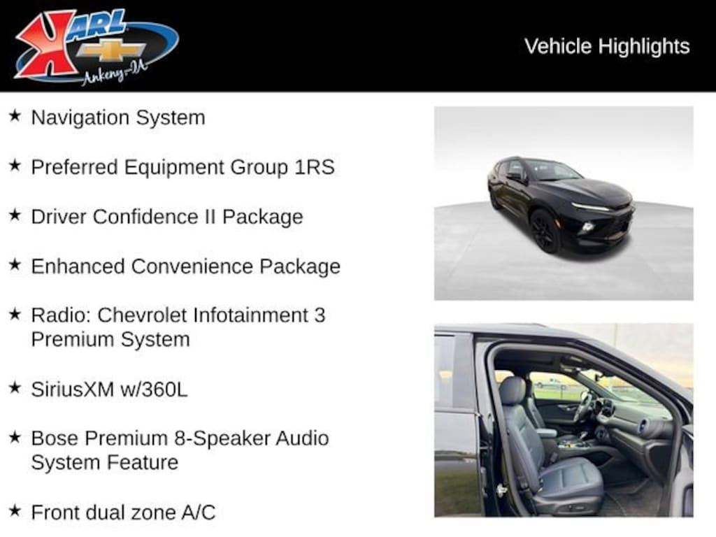 At Karl Chevrolet we want to help you find the best new or used car in Ankeny that suits your needs. Check out the 2024 Chevrolet Blazer For Sale in Ankeny, IA. When you buy a new car at Karl Chevrolet you know you're finding a vehicle you can rely on. We have a great selection of Platinum Quality Pre-Owned Vehicles. We also pride ourselves in creating a friendly atmosphere and reliable new car dealership that you can trust. Call us with any questions about our 2024 Chevrolet Blazer and our experts will be glad to help you! (515) 299-4300. *Equipment and options are generated by a 3rd party vendor, exact vehicle options may vary. Please see a salesperson for complete details and vehicle information.
