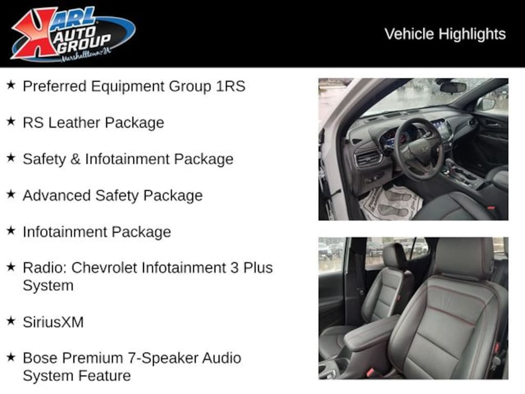 AWD, 120-Volt Power Outlet, 2 Rear USB Charging-Only Ports, 2 USB Data Ports, 2 USB Data Ports w/SD Card Reader, Adaptive Cruise Control, Advanced Safety Package, Bluetooth® For Phone, Bose Premium 7-Speaker Audio System Feature, Driver Seatback Map Pocket, HD Surround Vision, Heated Steering Wheel, Infotainment Package, Outside Heated Power-Adjustable Mirrors, Perforated Leather-Appointed Seat Trim, Preferred Equipment Group 1RS, Radio: Chevrolet Infotainment 3 Plus System, RS Leather Package, Safety & Infotainment Package, SiriusXM.