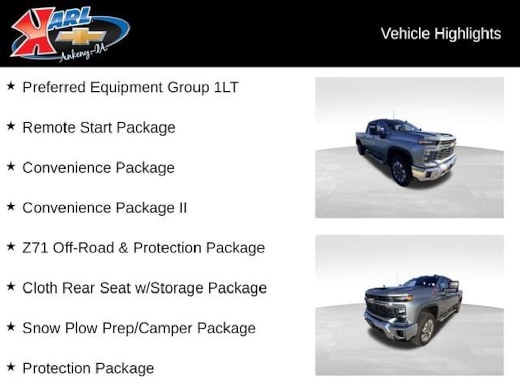 Don't miss your chance to experience the power, capability, and premium features of this exceptional 2024 Chevrolet Silverado 2500HD LT CREW LT. Visit Karl Chevrolet of Ankeny, the Nation's #1 CarBravo Dealer, and let our experts help you find the perfect truck to meet your needs.