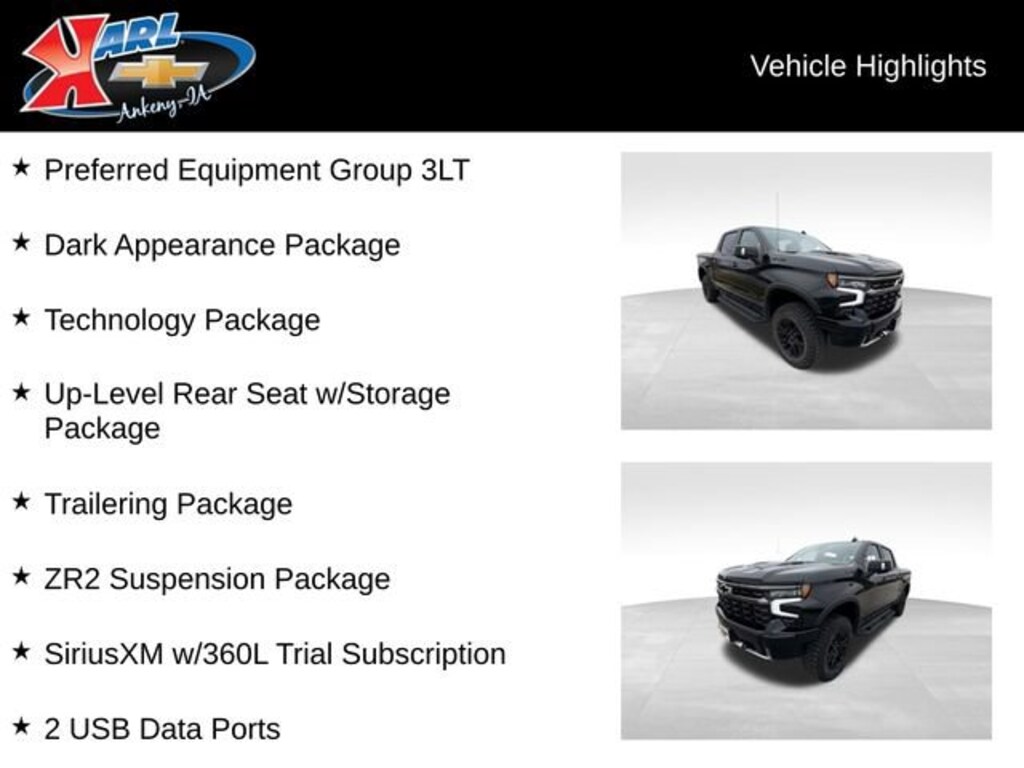 Recent Arrival! CARFAX One Owner, Local Trade, Sold New at Karls & All Services Done at Karls! Equipped With Running Boards! Clean CARFAX. Certified. Black 2025 Chevrolet Silverado 1500 ZR2 4WD CREW CAB 147 ZR 3.0L I6 10-Speed Automatic, 4WD, Jet Black/Graystone Leather, 12.3 Multicolor Reconfigurable Digital Display, 15 Diagonal Multicolor Head-Up Display, 2 USB Data Ports, 2nd Row Heated Outboard Seats, Adaptive Cruise Control, All-Weather Floor Liner (LPO), Apple CarPlay/Android Auto, Auto High-beam Headlights, Auto-Dimming Inside Rear-View Mirror, Bed View Camera, Bluetooth® For Phone, Chevytec Spray-On Black Bedliner, Color-Keyed Carpeting Floor Covering, Dark Appearance Package, Deep-Tinted Glass, Driver Memory, Dual Rear USB Ports (Charge Only), Electric Rear-Window Defogger, Electronic Cruise Control, EZ Lift Power Lock & Release Tailgate, Floor Mounted Center Console, Forward Collision Alert, Front dual zone A/C, Front Frame-Mounted Black Recovery Hooks, Front LED Fog Lamps, Front Rain-Sensing Wipers, HD Surround Vision, Heated Driver & Front Outboard Passenger Seats, Heated Steering Wheel, Heavy-Duty Air Filter, High Gloss Black Mirror Caps, Hill Descent Control, Hitch Guidance w/Hitch View, In-Vehicle Trailering System App, Integrated Trailer Brake Controller, Keyless Open & Start, Lane Keep Assist w/Lane Departure Warning, LED Cargo Area Lighting, Manual Tilt/Telescoping Steering Column, Multi-Flex Tailgate, OnStar Services Capable, Outside Heated Power-Adjustable Mirrors, Performance Red Recovery Hooks, Perimeter Lighting, Power driver seat, Power Sliding Rear Window w/Rear Defogger, Power Sunroof, Power Tilt & Telescoping Steering Column, Power windows, Preferred Equipment Group 3LT, Premium Bose 7-Speaker Sound System, Rear Camera Mirror, Rear Cross Traffic Braking, Rear Pedestrian Alert, Rear Wheelhouse Liners, Remote Vehicle Starter System, Safety Alert Seat, SiriusXM w/360L Trial Subscription, Steering Wheel Audio Controls, Technology Package, Teen Driver, Theft Deterrent System (Unauthorized Entry), Tire Pressure Monitoring System, Trailer Camera Provisions, Trailer Side Blind Zone Alert, Trailering Package, Ultrasonic Front & Rear Park Assist, Universal Home Remote, Up-Level Rear Seat w/Storage Package, Ventilated Driver & Front Passenger Seats, Wheels: 18 x 8.5 Gloss Black, Wi-Fi Hot Spot Capable, Wrapped Steering Wheel, ZR2 Suspension Package. 20/23 City/Highway MPG 10-Speed Automatic 4WD