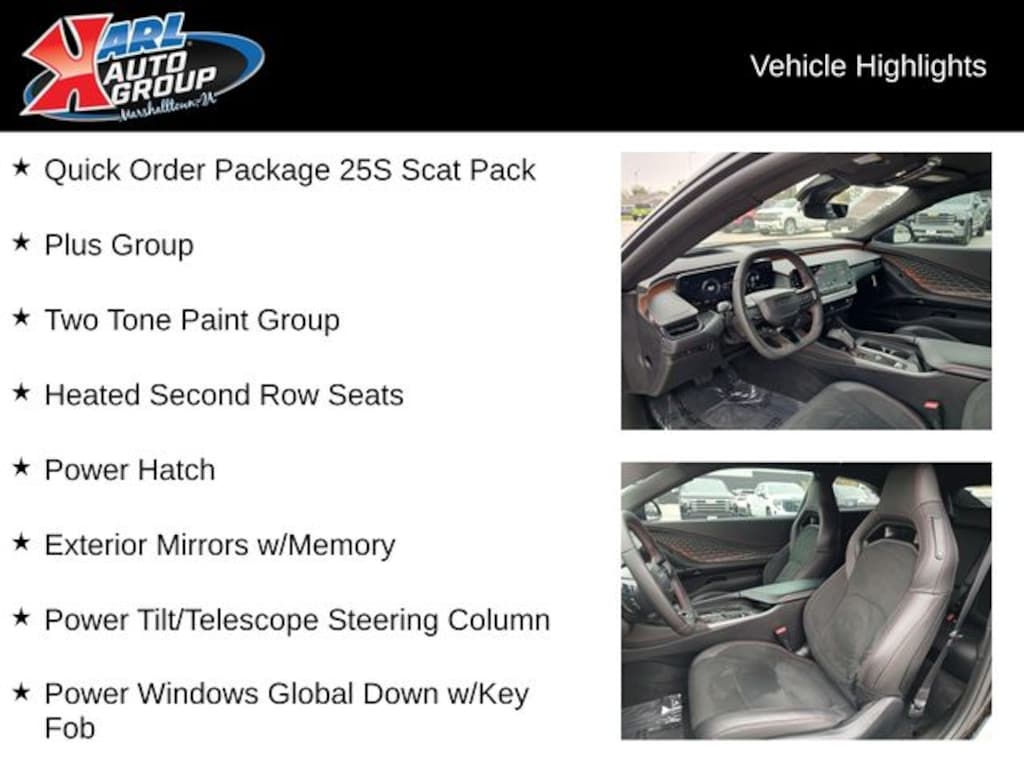 Recent Arrival! CARFAX One-Owner. Clean CARFAX. Diamond Black Crystal Pearlcoat 2025 Dodge Charger 2D Coupe R/T Scat Pack Electric Motor 82/73 City/Highway MPG 1-Speed AutomaticAWD, Black Artificial Leather, Ambient Light Color Control, Automatic High-Beam Headlamp Control, Black Color Multi-Function Mirrors, Exterior Mirrors Logo Lamps, Exterior Mirrors w/Memory, Front Cubby Bin w/Light, Frunk, Glove Box Lamp, Heated Exterior Mirrors, Heated Front Seats, Heated Second Row Seats, High Back Bucket Seats, Illuminated Door Pull Handles, Leather Performance Seats, LED Footwell Lighting, LED Map Pockets, Map-In-Cluster Display, Plus Group, Power 4-Way Driver Lumbar Adjust, Power 4-Way Passenger Lumbar Adjust, Power Adjust 12-Way Driver Seat, Power Adjust 12-Way Front Passenger Seat, Power Adjust Mirrors, Power Hatch, Power Tilt/Telescope Steering Column, Power Windows Global Down w/Key Fob, Premium Door Trim Panel, Premium Instrument Panel, Premium Interior Accents, Premium LED Low-High Reflective Headlamps, Quick Order Package 25S Scat Pack, Radio, Driver Seat, Mirrors & Steering Column Memory, Rain Sensitive Windshield Wipers, Surround View Camera System, Two Tone Paint Group, Ventilated Front Seats, Windshield Wiper De-Icer, Wireless Charging Pad.