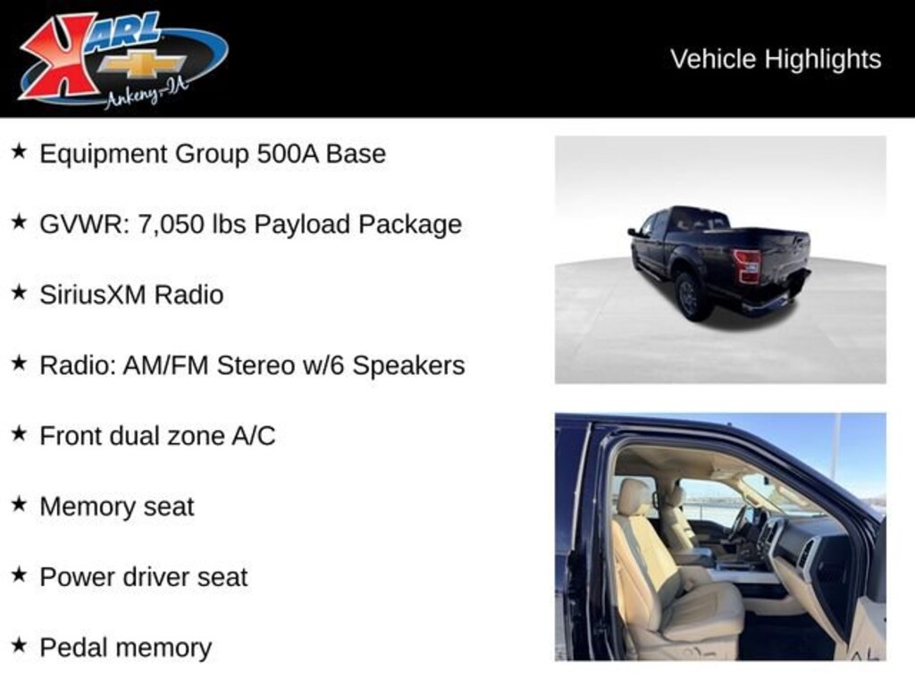 Recent Arrival! Certified. Black Metallic 2019 Ford F-150 Lariat LARIAT 4WD SUPERCREW 5.0L V8 4WD, AppLink/Apple CarPlay and Android Auto, Auto High-beam Headlights, Class IV Trailer Hitch Receiver, Equipment Group 500A Base, Exterior Parking Camera Rear, Front dual zone A/C, GVWR: 7,050 lbs Payload Package, Heated front seats, Memory seat, Pedal memory, Power driver seat, Radio: AM/FM Stereo w/6 Speakers, SiriusXM Radio, SYNC 3, Ventilated front seats, Voice-Activated Touchscreen Navigation. 16/22 City/Highway MPG 10-Speed Automatic 4WDAt Karl Chevrolet we want to help you find the best new or used car in Ankeny that suits your needs. Check out the 2019 Ford F-150 For Sale in Ankeny, IA. When you buy a new car at Karl Chevrolet you know you're finding a vehicle you can rely on. We have a great selection of Platinum Quality Pre-Owned Vehicles. We also pride ourselves in creating a friendly atmosphere and reliable new car dealership that you can trust. Call us with any questions about our 2019 Ford F-150 and our experts will be glad to help you! (515) 299-4300. *Equipment and options are generated by a 3rd party vendor, exact vehicle options may vary. Please see a salesperson for complete details and vehicle information.Certification Program Details: Karl Chevrolet of Ankeny, The Nation's #1 CarBravo certified dealer, where platinum quality vehicles and unmatched benefits come together! This vehicle qualifies for our CarBravo Certified program reserved for the highest-quality pre-owned vehicles that are 10 model years or newer and have less than 100,000 miles. Every CarBravo Certified vehicle includes: ? Comprehensive 126-Point Inspection Professionally inspected by factory-trained technicians to meet strict mechanical, safety, and cosmetic standards. ? 6-Month / 6,000-Mile Bumper-to-Bumper Limited Warranty Enjoy added peace of mind with extensive coverage from the day you drive off the lot. ? 24/7 Roadside Assistance & Courtesy Transportation Flat tire? Dead battery? Need a tow? You're covered anywhere, anytime throughout the warranty period. ? Vehicle History & Title Guarantee Clean title, completed safety recalls, and a full CARFAX® or AutoCheck® report provided for complete transparency. ? 10-Day / 500-Mile Exchange Promise If you donât absolutely love it, bring it back and exchange it no hassle, no stress. Experience peace of mind and premium protection exclusively from Karl Chevrolet of Ankeny, the Nation's #1 CarBravo Certified Deale