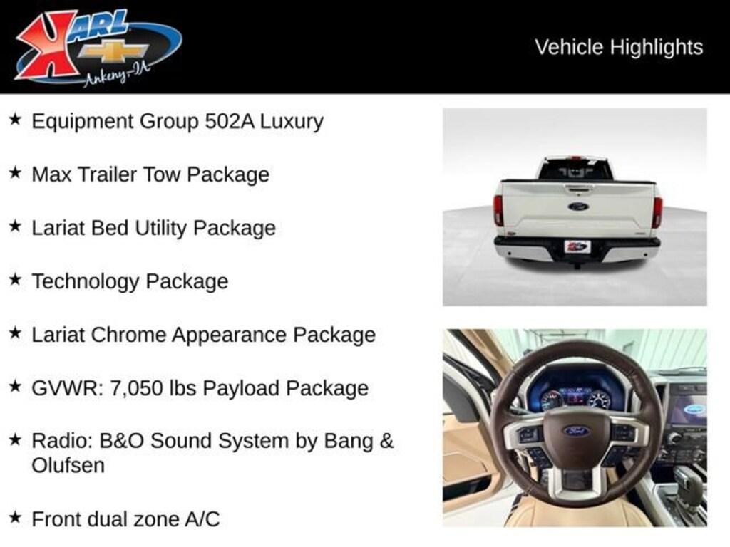Certification Program Details: Karl Chevrolet of Ankeny, The Nation's #1 CarBravo Certified Dealer! Every CarBravo Certified vehicle includes: Comprehensive 126-Point Inspection Professionally inspected by factory-trained technicians to meet strict mechanical, safety, and cosmetic standards. 12-Month / 12,000-Mile Bumper-to-Bumper Limited Warranty Enjoy added peace of mind with extensive coverage from the day you drive off the lot. 24/7 Roadside Assistance & Courtesy Transportation Flat tire? Dead battery? Need a tow? You're covered anywhere, anytime throughout the warranty period. Vehicle History & Title Guarantee Clean title, completed safety recalls, and a full CARFAX® or AutoCheck® report provided for complete transparency. 10-Day / 500-Mile Exchange Promise If you don't absolutely love it, bring it back and exchange it no hassle, no stress. Experience peace of mind and premium protection exclusively from Karl Chevrolet of Ankeny, the Nation's #1 CarBravo Dealer! Radio: B&O Sound System by Bang & Olufsen Front dual zone A/C Memory seat Pedal memory Power driver seat Universal Garage Door Opener Power Tilt/Telescoping Steering Column w/Memory Upgraded Front Stabilizer Bar Remote Start System w/Remote Tailgate Release Twin Panel Moonroof Active Park Assist Exterior Parking Camera Rear Auto High-beam Headlights Engine Oil CoolerThis stunning 2020 Ford F-150 Lariat is a true powerhouse, packed with premium features that elevate your driving experience. Under the hood, the 3.5L V6 EcoBoost engine delivers exceptional performance, while the 10-speed automatic transmission and 4-wheel drive ensure seamless power delivery and confident handling in any conditions.The exterior of this F-150 is equally impressive, with a bold and distinctive design that commands attention. The Lariat trim level adds a touch of luxury, with features like the chrome-accented grille, angular step bars, and LED lighting that create a striking visual presence. Step inside, and you'll be greeted by a spacious and well-appointed cabin, featuring premium leather-trimmed seats, heated and ventilated front seats, and a state-of-the-art infotainment system with navigation and a premium sound system.But this F-150 is more than just a pretty face. It's a true workhorse, with a robust towing capacity and a host of utility features that make it the perfect companion for your next adventure or job site. The Lariat Bed Utility Package, BoxLink system, and LED box lighting ensure that you can easily organize and access your cargo, while the Max Trailer Tow Package provides the power and capability you need to haul your heaviest loads.This 2020 Ford F-150 Lariat is a true standout in the full-size truck segment, offering a winning combination of performance, utility, and premium features. And with the added peace of mind of Karl Chevrolet's CarBravo Certified program, you can drive with confidence, knowing that your investment is protected.At Karl Chevrolet we want to help you find the best new or used car in Ankeny that suits your needs. When you buy a new car at Karl Chevrolet you know you're finding a vehicle you can rely on. We have a great selection of Platinum Quality Pre-Owned Vehicles. We also pride ourselves in creating a friendly atmosphere and a reliable Dealership that you can trust. Call us and our experts will be glad to help you! (515) 299-4300. *Equipment and options are generated by a 3rd party vendor, exact vehicle options may vary. Please see a salesperson for complete details and vehicle information.