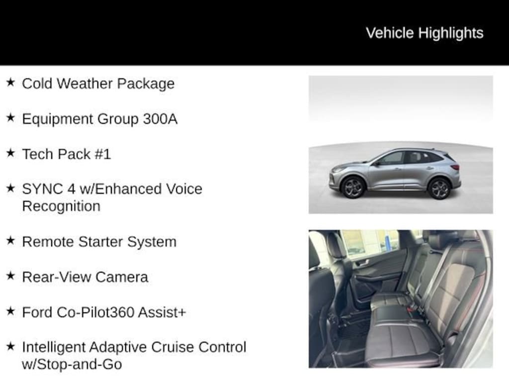 The Escape ST-Line also comes equipped with the advanced Ford Co-Pilot360 Assist+ suite of driver-assist technologies. Features like Intelligent Adaptive Cruise Control with Stop-and-Go, Evasive Steering Assist, and Speed Sign Recognition work together to help keep you safe and confident behind the wheel.
