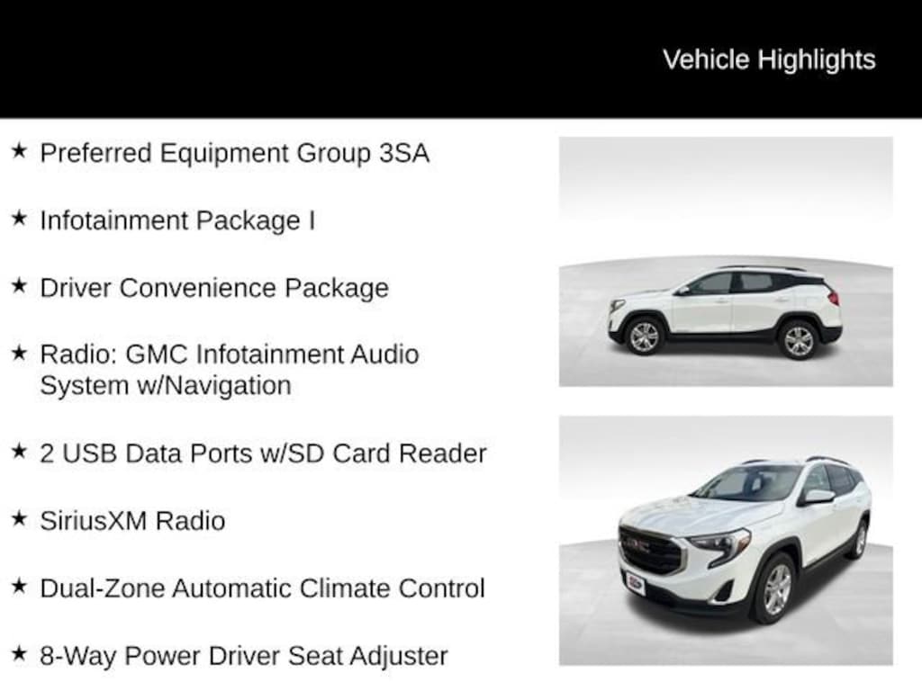 110-Volt Power Outlet, 2 USB Data Ports, 2 USB Data Ports w/SD Card Reader, 4.2 Multi-Color Enhanced Driver Information Screen, 8-Way Power Driver Seat Adjuster, Driver & Front Passenger Heated Seats, Driver Convenience Package, Dual-Zone Automatic Climate Control, HD Rear Vision Camera, Infotainment Package I, Power Driver Lumbar Control, Preferred Equipment Group 3SA, Radio: GMC Infotainment Audio System w/Navigation, Remote Start, Roof-Mounted Luggage Rack Black Side Rails, SiriusXM Radio.