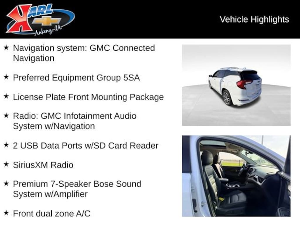 At Karl Chevrolet we want to help you find the best new or used car in Ankeny that suits your needs. When you buy a new car at Karl Chevrolet you know you're finding a vehicle you can rely on. We have a great selection of Platinum Quality Pre-Owned Vehicles. We also pride ourselves in creating a friendly atmosphere and a reliable Dealership that you can trust. Call us and our experts will be glad to help you! (515) 299-4300. *Equipment and options are generated by a 3rd party vendor, exact vehicle options may vary. Please see a salesperson for complete details and vehicle information.