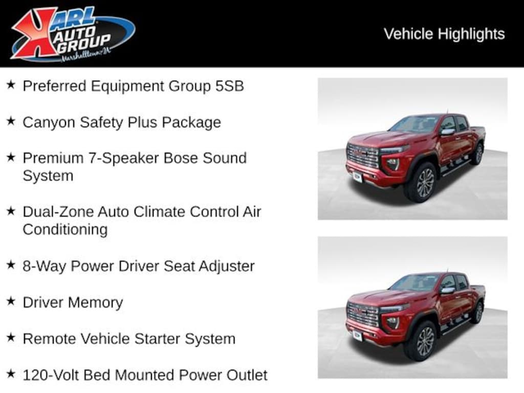 Recent Arrival! Certified. Clean CARFAX. Volcanic Red 2026 GMC Canyon 4D Crew Cab Denali 2.7L I4 Turbocharged DOHC 16V LEV3-SULEV30 310hp 18/22 City/Highway MPG 8-Speed Automatic 4WD, 120-Volt Bed Mounted Power Outlet, 2 Rear USB Ports in Center Console (Charge-Only), 5" Rectangular Chrome Assist Steps, 6-Way Power Passenger Seat Adjuster, 8-Way Power Driver Seat Adjuster, Adaptive Cruise Control, Automatic Emergency Braking, Blind Zone Steering Assist w/Trailering, Canyon Pro Safety, Canyon Safety Plus Package, Driver & Front Passenger Illuminated Visors, Driver & Front Passenger Ventilated Seats, Driver Memory, Driver Seatback Map Pocket, Dual-Zone Auto Climate Control Air Conditioning, EZ-Lift & Lower Tailgate, Following Distance Indicator, Forward Collision Alert, Front LED Fog Lamps, Front Pedestrian & Bicyclist Braking, HD Surround Vision, Heated Driver & Front Passenger Seats, Heated Steering Wheel, Inside Rear-View Auto-Dimming Mirror, IntelliBeam Automatic High Beam On/Off, Interior Overhead Courtesy Light w/Dual Reading Lamp, Lane Keep Assist w/Lane Departure Warning, Multicolor 6.3" Diagonal Head-Up Display, MultiStow Tailgate Storage Compartment, Power Driver Lumbar Control Seat Adjuster, Power Passenger Lumbar Control Seat Adjuster, Preferred Equipment Group 5SB, Premium 7-Speaker Bose Sound System, Rear Center Fold-Down Armrest w/2 Cupholders, Rear Cross Traffic Braking, Rear of Console 120-Volt Power Outlet, Rear Pedestrian Alert, Remote Vehicle Starter System, Safety Alert Seat, Spray-On Bedliner w/GMC Logo, Tailgate Keyed Cylinder Lock, Tilt & Telescopic Manual Steering Column, Ultrasonic Rear Park Assist, Wireless Phone Charging.
