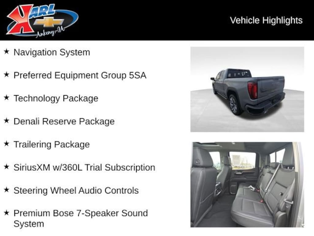 Recent Arrival! CARFAX One-Owner. Clean CARFAX. Certified. Sterling Metallic 2026 GMC Sierra 1500 Denali 4WD CREW CAB 147 DE EcoTec3 5.3L V8 10-Speed Automatic, 4WD, Black Leather, 170 Amp Alternator, 2 Charge/Data USB Ports Inside Center Console, 2 Type-C Charge-Only Rear USB Ports, 2 USB Ports, Apple CarPlay/Android Auto, Auto High-beam Headlights, Auto-Locking Rear Differential, Auxiliary External Transmission Oil Cooler, Bed View Camera, Chrome Header w/Signature Denali Chrome Grille, Chrome Recovery Hooks, Chrome Wheel To Wheel Assist Steps, Color-Keyed Carpeting Floor Covering, Deep-Tinted Glass, Denali Reserve Package, Driver Memory, Electric Rear-Window Defogger, Floor-Mounted Center Console, Forward Collision Alert, Front dual zone A/C, Front Rain-Sensing Wipers, GMC MultiPro Power Steps, HD Surround Vision, Heated 2nd Row Outboard Seats, Heated Driver & Front Outboard Passenger Seating, Heated steering wheel, Heavy-Duty Air Filter, Hill Descent Control, Hitch Guidance, Hitch View, In-Vehicle Trailering System App, Integrated Trailer Brake Controller, Keyless Open & Start, Lane Keep Assist w/Lane Departure Warning, LED Cargo Area Lighting, Multicolor 15 Diagonal Head-Up Display, Navigation System, OnStar Services Capable, Perimeter Lighting, Power Door Locks, Power driver seat, Power Rake & Telescoping Steering Column, Power Sliding Rear Window w/Rear Defogger, Power Sunroof, Power windows, Preferred Equipment Group 5SA, Premium Bose 7-Speaker Sound System, Push Button Start, Rear Camera Mirror, Rear Cross Traffic Braking, Rear Pedestrian Detection, Rear Wheelhouse Liners, Remote Vehicle Starter System, SiriusXM w/360L Trial Subscription, Spray-On Pickup Bedliner w/GMC Logo, Steering Wheel Audio Controls, Technology Package, Theft Deterrent System (Unauthorized Entry), Trailer Camera Provisions, Trailer Side Blind Zone Alert, Trailering Package, Ultrasonic Front & Rear Park Assist, Universal Home Remote, Ventilated Driver & Front Passenger Seats, Wheel Locks (Set of 4) (LPO), Wheels: 22 x 9 Painted Aluminum, Wi-Fi Hotspot Capable, Wireless Apple CarPlay/Wireless Android Auto. 15/18 City/Highway MPG 10-Speed Automatic 4WDCertification Program Details: Karl Chevrolet of Ankeny, The Nation's #1 CarBravo certified dealer, where platinum quality vehicles and unmatched benefits come together! This vehicle qualifies for our CarBravo Certified program reserved for the highest-quality pre-owned vehicles that are 10 model years or newer and have less than 100,000 miles. Every CarBravo Certified vehicle includes: -Comprehensive 126-Point Inspection Professionally inspected by factory-trained technicians to meet strict mechanical, safety, and cosmetic standards. -12-Month / 12,000-Mile Bumper-to-Bumper Limited Warranty Enjoy added peace of mind with extensive coverage from the day you drive off the lot. -24/7 Roadside Assistance & Courtesy Transportation Flat tire? Dead battery? Need a tow? You're covered anywhere, anytime throughout the warranty period. -Vehicle History & Title Guarantee Clean title, completed safety recalls, and a full CARFAX® or AutoCheck® report provided for complete transparency. -10-Day / 500-Mile Exchange Promise If you don’t absolutely love it, bring it back and exchange it no hassle, no stress. Experience peace of mind and premium protection exclusively from Karl Chevrolet of Ankeny, the Nation's #1 CarBravo Certified Dealer