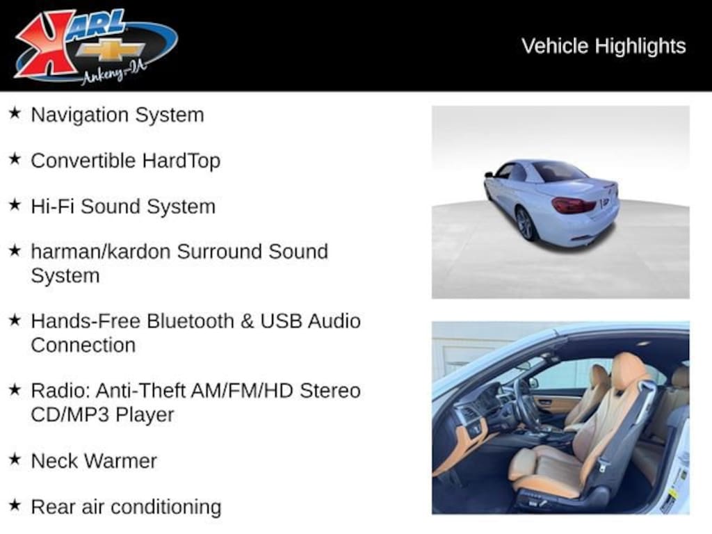 At Karl Chevrolet we want to help you find the best new or used car in Ankeny that suits your needs. Check out the 2018 BMW 4 Series For Sale in Ankeny, IA. When you buy a new car at Karl Chevrolet you know you're finding a vehicle you can rely on. We have a great selection of Platinum Quality Pre-Owned Vehicles. We also pride ourselves in creating a friendly atmosphere and reliable new car dealership that you can trust. Call us with any questions about our 2018 BMW 4 Series and our experts will be glad to help you! (515) 299-4300. *Equipment and options are generated by a 3rd party vendor, exact vehicle options may vary. Please see a salesperson for complete details and vehicle information.