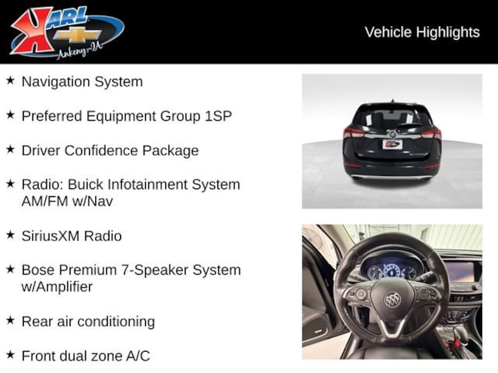 Elevate your driving experience with this stunning 2019 Buick Envision Premium II AWD. This premium crossover SUV is the perfect blend of style, performance, and cutting-edge technology, designed to elevate your daily commute and weekend adventures.- Panoramic Moonroof- Driver Confidence Package with Adaptive Cruise Control, Surround Vision, and Forward Automatic Braking- Bose Premium 7-Speaker Sound System- Buick Infotainment System with Navigation- Heated and Cooled Front Seats- Heated Rear Seats- Power Liftgate- Apple CarPlay and Android AutoThe Envision's turbocharged 2.0L 4-cylinder engine and smooth 9-speed automatic transmission deliver an exhilarating yet efficient driving experience, with an EPA-estimated 25 MPG on the highway. Coupled with the advanced all-wheel-drive system, this Envision provides confident handling and traction in all weather conditions.Slip into the luxurious, perforated leather-appointed seats and experience the premium craftsmanship that sets the Envision apart. The driver-centric cockpit features a Head-Up Display, 8-way power adjustable seats with memory, and a heated steering wheel for your ultimate comfort and convenience.Safety is also a top priority, with advanced driver assistance technologies like Surround Vision, Forward Automatic Braking, and Adaptive Cruise Control, giving you peace of mind on the road.As a Certified Pre-Owned Buick, this Envision has undergone a rigorous 172-point inspection and comes with the backing of a 6-year/100,000-mile powertrain warranty and a 12-month/12,000-mile comprehensive warranty. You can drive with confidence, knowing this Envision is ready to provide you with years of reliable and enjoyable ownership.At Karl Chevrolet, we want to help you find the best new or used car in Ankeny that suits your needs. When you buy a new car at Karl Chevrolet, you know you're finding a vehicle you can rely on. We have a great selection of Platinum Quality Pre-Owned Vehicles. We also pride ourselves in creating a friendly atmosphere and a reliable Dealership that you can trust. Call us and our experts will be glad to help you! (515) 299-4300. *Equipment and options are generated by a 3rd party vendor, exact vehicle options may vary. Please see a salesperson for complete details and vehicle information.