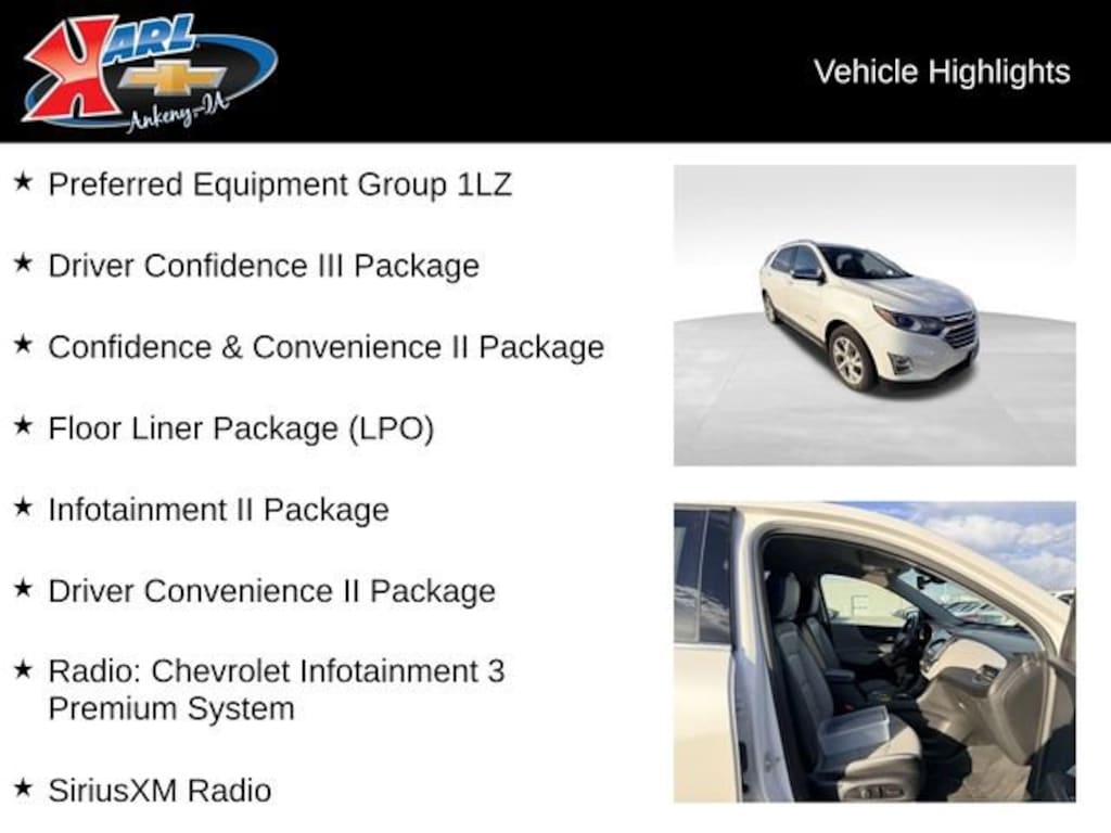 At Karl Chevrolet we want to help you find the best new or used car in Ankeny that suits your needs. Check out the 2020 Chevrolet Equinox For Sale in Ankeny, IA. When you buy a new car at Karl Chevrolet you know you're finding a vehicle you can rely on. We have a great selection of Platinum Quality Pre-Owned Vehicles. We also pride ourselves in creating a friendly atmosphere and reliable new car dealership that you can trust. Call us with any questions about our 2020 Chevrolet Equinox and our experts will be glad to help you! (515) 299-4300. *Equipment and options are generated by a 3rd party vendor, exact vehicle options may vary. Please see a salesperson for complete details and vehicle information.