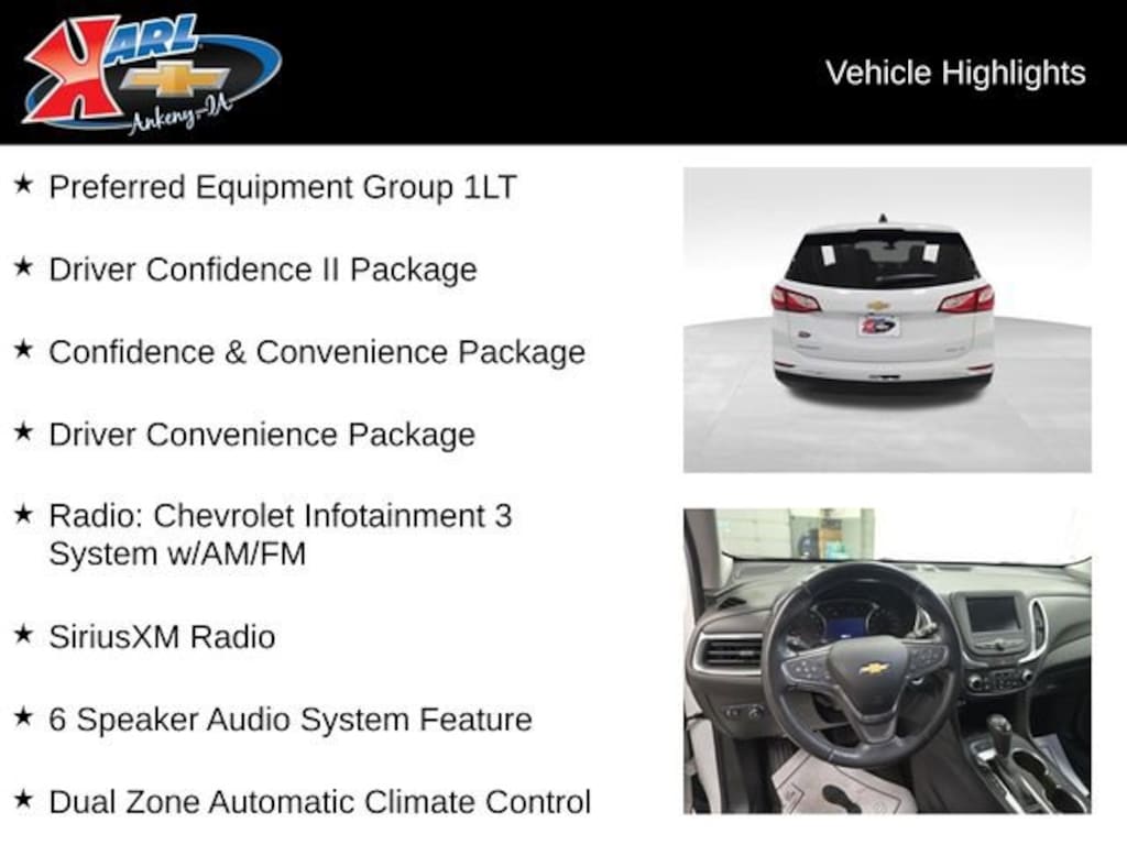 At Karl Chevrolet we want to help you find the best new or used car in Ankeny that suits your needs. When you buy a new car at Karl Chevrolet you know you're finding a vehicle you can rely on. We have a great selection of Platinum Quality Pre-Owned Vehicles. We also pride ourselves in creating a friendly atmosphere and a reliable Dealership that you can trust. Call us and our experts will be glad to help you! (515) 299-4300. *Equipment and options are generated by a 3rd party vendor, exact vehicle options may vary. Please see a salesperson for complete details and vehicle information.