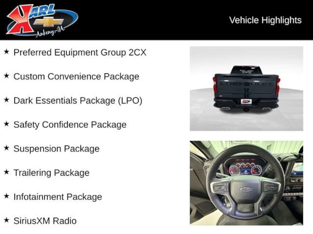 The Custom Trail Boss package adds a host of premium features, including 20-inch high-gloss black painted aluminum wheels, a Chevytec spray-on bedliner, and a Dark Essentials package that gives the exterior a bold, aggressive look. Inside, you'll enjoy the comfort of a 10-way power driver's seat with lumbar support, as well as an array of advanced technology features like the Chevrolet Infotainment 3 system with Apple CarPlay and Android Auto integration.