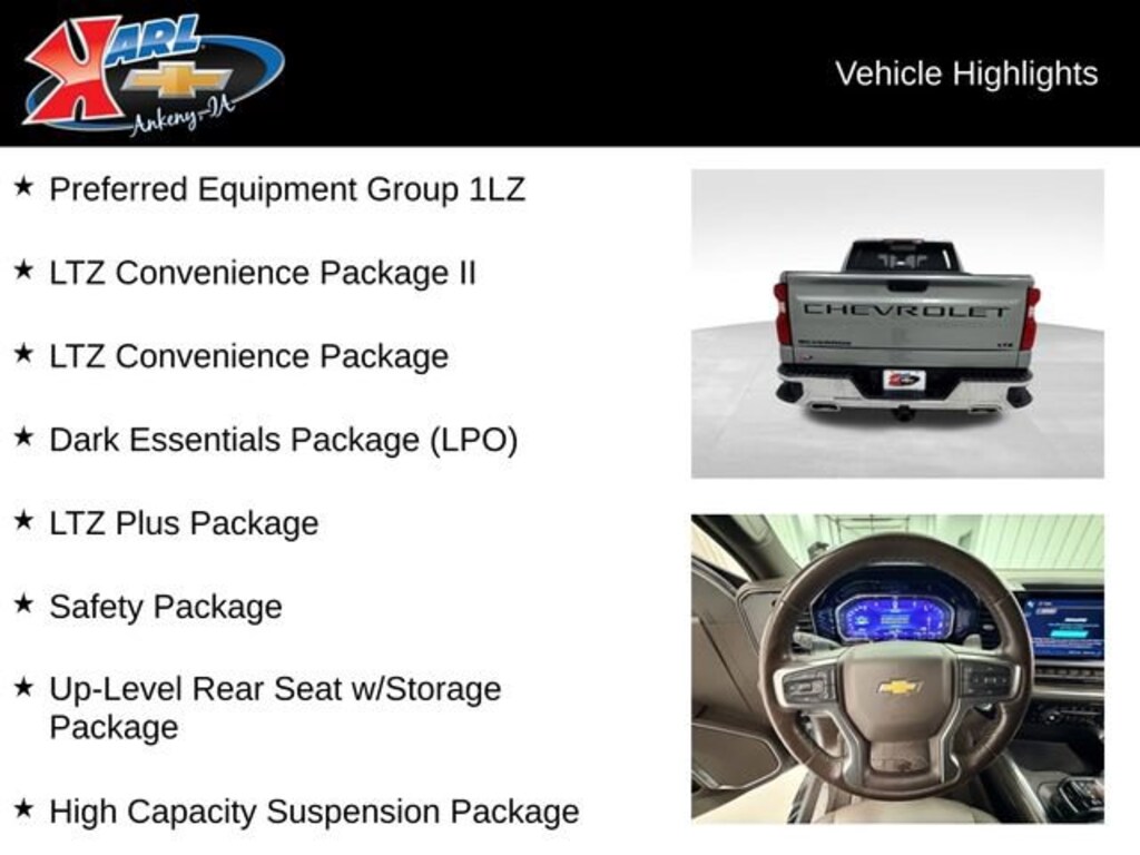 Certification Program Details: Karl Chevrolet of Ankeny, The Nation's #1 CarBravo Certified Dealer! Every CarBravo Certified vehicle includes: Comprehensive 126-Point Inspection Professionally inspected by factory-trained technicians to meet strict mechanical, safety, and cosmetic standards. 12-Month / 12,000-Mile Bumper-to-Bumper Limited Warranty Enjoy added peace of mind with extensive coverage from the day you drive off the lot. 24/7 Roadside Assistance & Courtesy Transportation Flat tire? Dead battery? Need a tow? You're covered anywhere, anytime throughout the warranty period. Vehicle History & Title Guarantee Clean title, completed safety recalls, and a full CARFAX® or AutoCheck® report provided for complete transparency. 10-Day / 500-Mile Exchange Promise If you don't absolutely love it, bring it back and exchange it no hassle, no stress. Experience peace of mind and premium protection exclusively from Karl Chevrolet of Ankeny, the Nation's #1 CarBravo Dealer! 3.0L I-6 Diesel Turbocharged (Duramax) LTZ Convenience Package II Chevytec Spray-On Bedliner, Black Dark Essentials Package (LPO) Tires, 275/60R20SL All-Terrain, Blackwall Engine Block HeaterThis 2023 Chevrolet Silverado 1500 LTZ 4WD Crew Cab 147 LT is a powerhouse of capability and comfort. With its 3.0L I-6 Diesel Turbocharged Duramax engine, this Silverado delivers exceptional towing and hauling performance, while also achieving an impressive 22 city and 27 highway MPG. The LTZ trim level pampers you with premium features like the LTZ Convenience Package II, which adds a rear sliding power window, universal home remote, rear heated outboard seats, and adaptive cruise control.Rugged yet refined, this Silverado boasts the Chevytec Spray-On Bedliner to protect your cargo, and the Dark Essentials Package that gives it a bold, blacked-out look. The 275/60R20SL All-Terrain tires and engine block heater further enhance the Silverado's capability, making it a true workhorse that can handle any task with ease.Certified through Karl Chevrolet's exclusive CarBravo program, this Silverado has undergone a comprehensive 126-point inspection by factory-trained technicians. It comes with a 12-month/12,000-mile bumper-to-bumper limited warranty, 24/7 roadside assistance, and a 10-day/500-mile exchange promise giving you the peace of mind and protection you deserve.Whether you're towing a trailer, hauling heavy loads, or simply enjoying the open road, this 2023 Chevrolet Silverado 1500 LTZ 4WD Crew Cab 147 LT is the perfect companion. Experience the power, capability, and premium features that make this Silverado a standout in its class.At Karl Chevrolet we want to help you find the best new or used car in Ankeny that suits your needs. When you buy a new car at Karl Chevrolet you know you're finding a vehicle you can rely on. We have a great selection of Platinum Quality Pre-Owned Vehicles. We also pride ourselves in creating a friendly atmosphere and a reliable Dealership that you can trust. Call us and our experts will be glad to help you! (515) 299-4300. *Equipment and options are generated by a 3rd party vendor, exact vehicle options may vary. Please see a salesperson for complete details and vehicle information.