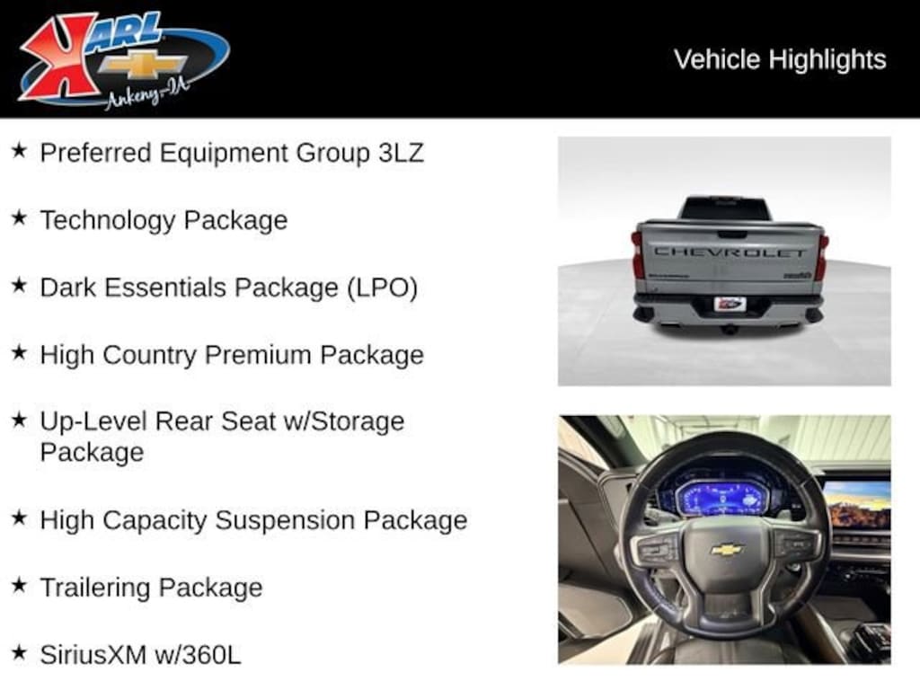 At Karl Chevrolet we want to help you find the best new or used car in Ankeny that suits your needs. When you buy a new car at Karl Chevrolet you know you're finding a vehicle you can rely on. We have a great selection of Platinum Quality Pre-Owned Vehicles. We also pride ourselves in creating a friendly atmosphere and a reliable Dealership that you can trust. Call us and our experts will be glad to help you! (515) 299-4300. *Equipment and options are generated by a 3rd party vendor, exact vehicle options may vary. Please see a salesperson for comple