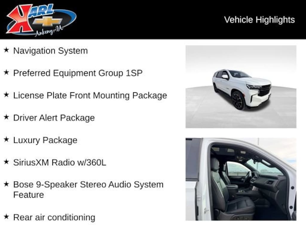 At Karl Chevrolet we want to help you find the best new or used car in Ankeny that suits your needs. When you buy a new car at Karl Chevrolet you know you're finding a vehicle you can rely on. We have a great selection of Platinum Quality Pre-Owned Vehicles. We also pride ourselves in creating a friendly atmosphere and a reliable Dealership that you can trust. Call us and our experts will be glad to help you! (515) 299-4300. *Equipment and options are generated by a 3rd party vendor, exact vehicle options may vary. Please see a salesperson for complete details and vehicle information.