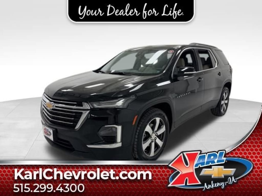 Certification Program Details: Karl Chevrolet of Ankeny, The Nation's #1 CarBravo Certified Dealer! Every CarBravo Certified vehicle includes: Comprehensive 126-Point Inspection Professionally inspected by factory-trained technicians to meet strict mechanical, safety, and cosmetic standards. 12-Month / 12,000-Mile Bumper-to-Bumper Limited Warranty Enjoy added peace of mind with extensive coverage from the day you drive off the lot. 24/7 Roadside Assistance & Courtesy Transportation Flat tire? Dead battery? Need a tow? You're covered anywhere, anytime throughout the warranty period. Vehicle History & Title Guarantee Clean title, completed safety recalls, and a full CARFAX® or AutoCheck® report provided for complete transparency. 10-Day / 500-Mile Exchange Promise If you don't absolutely love it, bring it back and exchange it no hassle, no stress. Experience peace of mind and premium protection exclusively from Karl Chevrolet of Ankeny, the Nation's #1 CarBravo Dealer! LT PREMIUM PACKAGE License Plate Front Mounting Package Preferred Equipment Group 3LT Rear Camera Mirror PackageThis stunning 2023 Chevrolet Traverse LT Leather AWD 4DR LT LEATHER is a remarkable SUV that offers exceptional versatility, comfort, and performance. Powered by a robust 3.6L V6 SIDI VVT engine paired with a smooth-shifting 9-Speed Automatic transmission, this Traverse delivers an impressive balance of power and efficiency, with an EPA-estimated 17 city/25 highway MPG.Stepping inside, you'll be greeted by a spacious and well-appointed interior, featuring premium leather-appointed seating, a Bose Premium 10-speaker audio system, and the advanced Chevrolet Infotainment 3 Plus system with connected navigation. The LT Premium Package adds a suite of advanced features, including Adaptive Cruise Control, Enhanced Automatic Emergency Braking, and HD Surround Vision, ensuring your driving experience is both enjoyable and secure.Exterior highlights include striking 20-inch machined face aluminum wheels, a power liftgate, and heated, power-folding body-color mirrors, adding both style and convenience to this exceptional Traverse. The sleek Black exterior color complements the premium look and feel of this SUV, making it a true head-turner on the road.As a CarBravo Certified vehicle, this 2023 Chevrolet Traverse LT Leather AWD 4DR LT LEATHER has undergone a comprehensive 126-point inspection by our factory-trained technicians. It also comes with a 12-month/12,000-mile bumper-to-bumper limited warranty, 24/7 roadside assistance, and a 10-day/500-mile exchange promise, giving you the peace of mind you deserve.At Karl Chevrolet, we want to help you find the best new or used car in Ankeny that suits your needs. When you buy a new car at Karl Chevrolet, you know you're finding a vehicle you can rely on. We have a great selection of Platinum Quality Pre-Owned Vehicles. We also pride ourselves in creating a friendly atmosphere and a reliable Dealership that you can trust. Call us and our experts will be glad to help you! (515) 299-4300. *Equipment and options are generated by a 3rd party vendor, exact vehicle options may vary. Please see a salesperson for complete details and vehicle information.