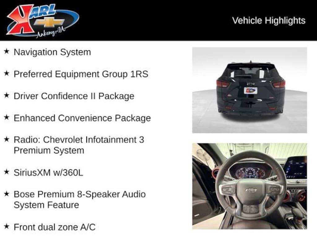 Certification Program Details: Karl Chevrolet of Ankeny, The Nation's #1 CarBravo Certified Dealer! Every CarBravo Certified vehicle includes: Comprehensive 126-Point Inspection Professionally inspected by factory-trained technicians to meet strict mechanical, safety, and cosmetic standards. 12-Month / 12,000-Mile Bumper-to-Bumper Limited Warranty Enjoy added peace of mind with extensive coverage from the day you drive off the lot. 24/7 Roadside Assistance & Courtesy Transportation Flat tire? Dead battery? Need a tow? You're covered anywhere, anytime throughout the warranty period. Vehicle History & Title Guarantee Clean title, completed safety recalls, and a full CARFAX® or AutoCheck® report provided for complete transparency. 10-Day / 500-Mile Exchange Promise If you don't absolutely love it, bring it back and exchange it no hassle, no stress. Experience peace of mind and premium protection exclusively from Karl Chevrolet of Ankeny, the Nation's #1 CarBravo Dealer!- Power Panoramic Tilt-Sliding Sunroof- Heated Steering Wheel- Heated Driver & Front Passenger Seats- Heated Rear Outboard Seating Positions- Ventilated Driver & Front Passenger Seats- Adaptive Cruise Control- Enhanced Automatic Emergency Braking- HD Surround Vision- Rear Camera Mirror- Safety Alert Seat- Navigation System- Apple CarPlay/Android Auto- Bose Premium 8-Speaker Audio SystemThis 2024 Chevrolet Blazer RS AWD 4DR RS is a stunning, well-equipped SUV that offers the perfect blend of style, capability, and advanced technology. Powered by a robust 3.6L V6 SIDI engine and equipped with an advanced 9-speed automatic transmission, this Blazer delivers an impressive 18 city / 26 highway MPG, ensuring you can tackle your daily drives and weekend adventures with confidence and efficiency.The exterior of this Blazer is dressed in a sleek and sophisticated Black finish, complemented by a range of premium features, including a power panoramic tilt-sliding sunroof, 20-inch Technical Gray aluminum wheels, and LED lighting. Step inside and you'll be greeted by a luxurious cabin adorned with perforated leather-appointed seating, a heated steering wheel, and a Bose premium audio system that will elevate your listening experience.Packed with advanced technology, the Blazer RS offers a wealth of convenience and safety features to enhance your driving experience. Enjoy the convenience of Apple CarPlay and Android Auto, the added security of HD Surround Vision and Rear Camera Mirror, and the peace of mind provided by Adaptive Cruise Control and Enhanced Automatic Emergency Braking.This Chevrolet Blazer RS is not only a stunning and capable SUV but also a true testament to the brand's commitment to quality and innovation. Visit Karl Chevrolet of Ankeny, the Nation's #1 CarBravo Certified Dealer, to experience this exceptional vehicle firsthand and discover how it can elevate your driving experience.At Karl Chevrolet we want to help you find the best new or used car in Ankeny that suits your needs. When you buy a new car at Karl Chevrolet you know you're finding a vehicle you can rely on. We have a great selection of Platinum Quality Pre-Owned Vehicles. We also pride ourselves in creating a friendly atmosphere and a reliable Dealership that you can trust. Call us and our experts will be glad to help you! (515) 299-4300. *Equipment and options are generated by a 3rd party vendor, exact vehicle options may vary. Please see a salesperson for complete details and vehicle information.