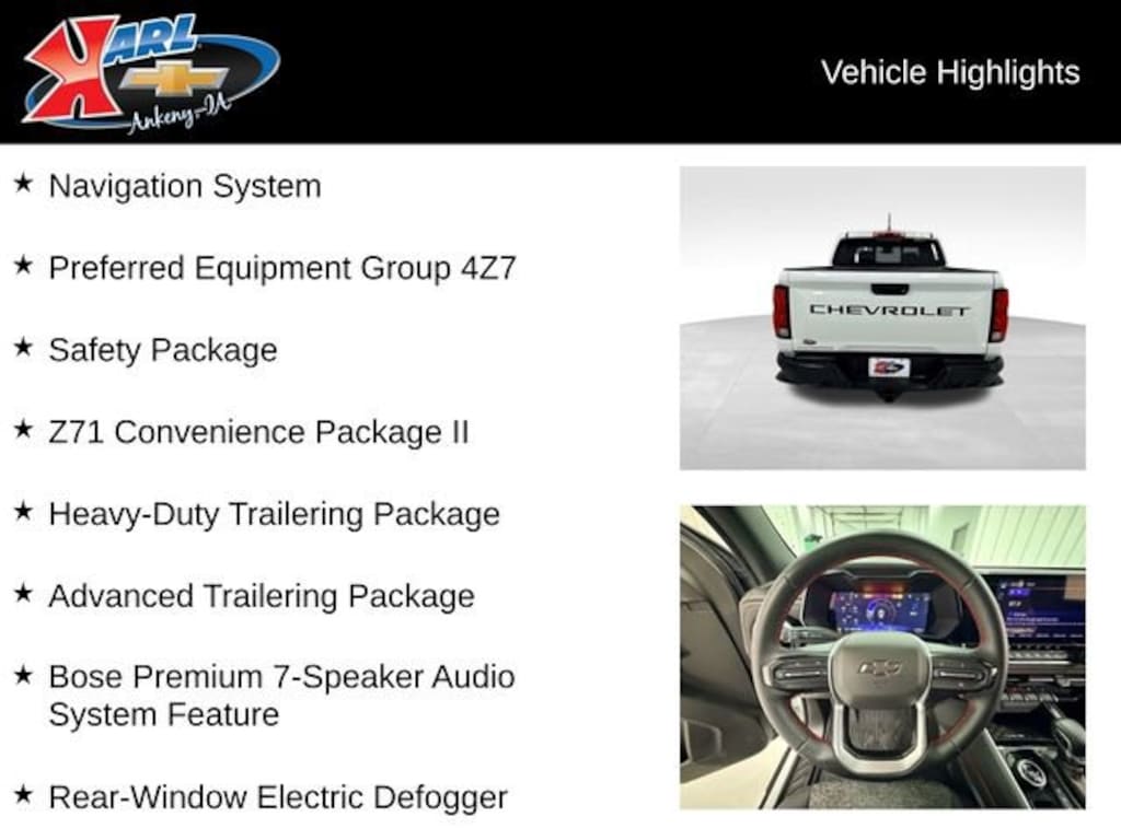 Certification Program Details: Karl Chevrolet of Ankeny, The Nation's #1 CarBravo Certified Dealer! Every CarBravo Certified vehicle includes: Comprehensive 126-Point Inspection Professionally inspected by factory-trained technicians to meet strict mechanical, safety, and cosmetic standards. 12-Month / 12,000-Mile Bumper-to-Bumper Limited Warranty Enjoy added peace of mind with extensive coverage from the day you drive off the lot. 24/7 Roadside Assistance & Courtesy Transportation Flat tire? Dead battery? Need a tow? You're covered anywhere, anytime throughout the warranty period. Vehicle History & Title Guarantee Clean title, completed safety recalls, and a full CARFAX® or AutoCheck® report provided for complete transparency. 10-Day / 500-Mile Exchange Promise If you don't absolutely love it, bring it back and exchange it no hassle, no stress. Experience peace of mind and premium protection exclusively from Karl Chevrolet of Ankeny, the Nation's #1 CarBravo Dealer!This 2024 Chevrolet Colorado Z71 4WD CREW CAB Z71 is packed with premium features that will elevate your driving experience. The Z71 Convenience Package II, Advanced Trailering Package, and Safety Package provide a wealth of advanced technology and convenience features, including: Bose Premium 7-Speaker Audio System Dual-Zone Automatic Climate Control Heated Front Seats Remote Start Power Driver's Seat with Lumbar Support Blind Zone Steering Assist with Trailering Rear Cross Traffic Braking Rear Park Assist And much more!Under the hood, this Colorado is powered by a robust 2.7L I4 Turbocharged engine that delivers an impressive 310 horsepower and up to 23 MPG on the highway. With its rugged 4WD capabilities, this Colorado is ready to take on any adventure, whether it's hauling your gear, towing your trailer, or conquering off-road terrain.This Colorado has been meticulously inspected and certified through the Karl Chevrolet CarBravo program. That means you can drive with confidence, knowing that this vehicle has been thoroughly checked and backed by a comprehensive warranty and roadside assistance package. With the 10-Day/500-Mile Exchange Promise, you can be sure that this Colorado is the perfect fit for your needs.At Karl Chevrolet, we're committed to providing our customers with the highest level of service and satisfaction. Our knowledgeable sales team is here to answer any questions you may have and help you find the perfect vehicle to suit your lifestyle. Come in and experience the Karl Chevrolet difference today!At Karl Chevrolet we want to help you find the best new or used car in Ankeny that suits your needs. When you buy a new car at Karl Chevrolet you know you're finding a vehicle you can rely on. We have a great selection of Platinum Quality Pre-Owned Vehicles. We also pride ourselves in creating a friendly atmosphere and a reliable Dealership that you can trust. Call us and our experts will be glad to help you! (515) 299-4300. *Equipment and options are generated by a 3rd party vendor, exact vehicle options may vary. Please see a salesperson for complete details and vehicle information.