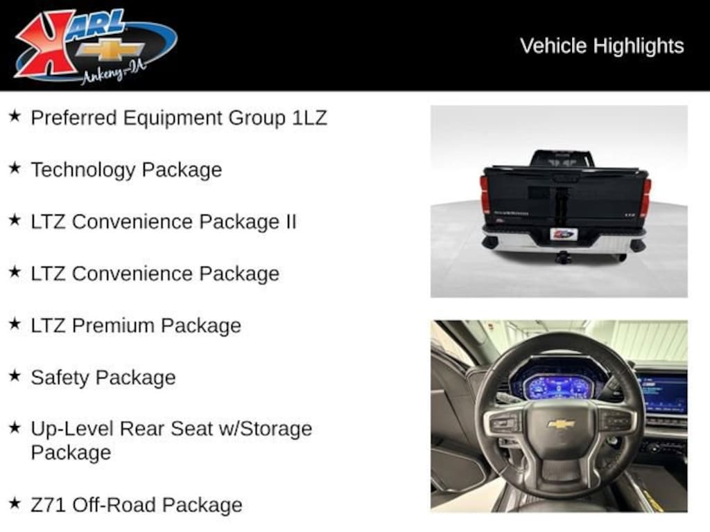 Recent Arrival! CARFAX One-Owner. Local Trade. Sold New at Karls. Running Boards. Tonneau Cover. Clean CARFAX. Certified. Black 2024 Chevrolet Silverado 2500HD LTZ 4WD CREW CAB 159 LTZ Duramax 6.6L V8 Turbodiesel 10-Speed Automatic, 4WD, Jet Black Leather, 120-Volt Bed Mounted Power Outlet, 120-Volt Interior Power Outlet, 15 Diagonal Multicolor Head-Up Display, 170 Amp Alternator, 2 Charge/Data USB Ports Inside Center Console, 6-Speaker Audio System, Adaptive Cruise Control, Apple CarPlay/Android Auto, Auto High-beam Headlights, Auto-Dimming Inside Rear-View Mirror, Bed View Camera w/2 Trailer Camera Provisions, Black Chevytec Spray-On Bedliner, Bluetooth® For Phone, BOSE Premium 7-Speaker Sound System, Chevrolet Connected Access Capable, Chrome Door Handles, Chrome Mirror Caps, Color-Keyed Carpeting Floor Covering, Compass, Deep-Tinted Glass, Electric Rear-Window Defogger, Electronic Cruise Control w/Set & Resume Speed, EZ Lift Power Lock & Release Tailgate, Floor-Mounted Center Console, Front Bucket Seats, Front dual zone A/C, Front LED Fog Lamps, Front Rain-Sensing Wipers, Front Rubberized Vinyl Floor Mats, HD Rear Vision Camera, HD Surround Vision, Heated 2nd Row Outboard Seats, Heated Driver & Front Outboard Passenger Seating, Heated Steering Wheel, Hill Descent Control, Hitch Guidance w/Hitch View, In-Vehicle Trailering App System, Keyless Open & Start, LED Cargo Area Lighting, LTZ Convenience Package, LTZ Convenience Package II, LTZ Premium Package, Manual Tilt & Telescoping Steering Column, Memory seat, Off-Road Suspension, OnStar & Chevrolet Connected Services Capable, Power Door Locks, Power driver seat, Power Front Windows w/Driver Express Up/Down, Power Front Windows w/Passenger Express Up/Down, Power Rear Windows w/Express Down, Power Sliding Rear Window w/Defogger, Preferred Equipment Group 1LZ, Push Button Start, Rear Camera Mirror, Rear Cross Traffic Alert, Rear Rubberized Vinyl Floor Mats, Rear Wheelhouse Liners, Remote Vehicle Starter System, Safety Alert Seat, Safety Package, SiriusXM w/360L, Standard Tailgate, Steering Wheel Audio Controls, Suspension Package, Technology Package, Trailer Camera Provisions, Trailer Side Blind Zone Alert, Ultrasonic Front & Rear Park Assist, Unauthorized Entry Theft-Deterrent System, Universal Home Remote, Up-Level Rear Seat w/Storage Package, Ventilated Driver & Front Passenger Seats, Wheels: 20 12-Spoke Bright Chrome (DISC), Wi-Fi Hotspot Capable, Wireless Charging, Wireless Phone Projection, Wrapped Steering Wheel, Z71 Off-Road Package. 10-Speed Automatic 4WDCertification Program Details: Karl Chevrolet of Ankeny, your newest CarBravo dealer, where platinum quality vehicles and unmatched benefits come together! -Comprehensive Limited Bumper to Bumper Warranty. -24/7 Roadside Assistance: -Multi-Point Vehicle Inspection: Every vehicle undergoes a Platinum Quality Certified Inspection known throughout the industry to ensure top quality. -Vehicle Exchange Program. Within 10-Days and 500 miles -Complimentary Vehicle History Report -Nationwide Dealer Network Support: Enjoy the backing of the extensive CarBravo and GM dealership network. -OnStar and SiriusXM Trials: Enjoy connected services and entertainment with included trial subscriptions. -Terms and conditions may apply. With every vehicle purchased, you'll enjoy the peace of mind that comes with a limited warranty, 24/7 roadside assistance, and a comprehensive vehicle inspection.